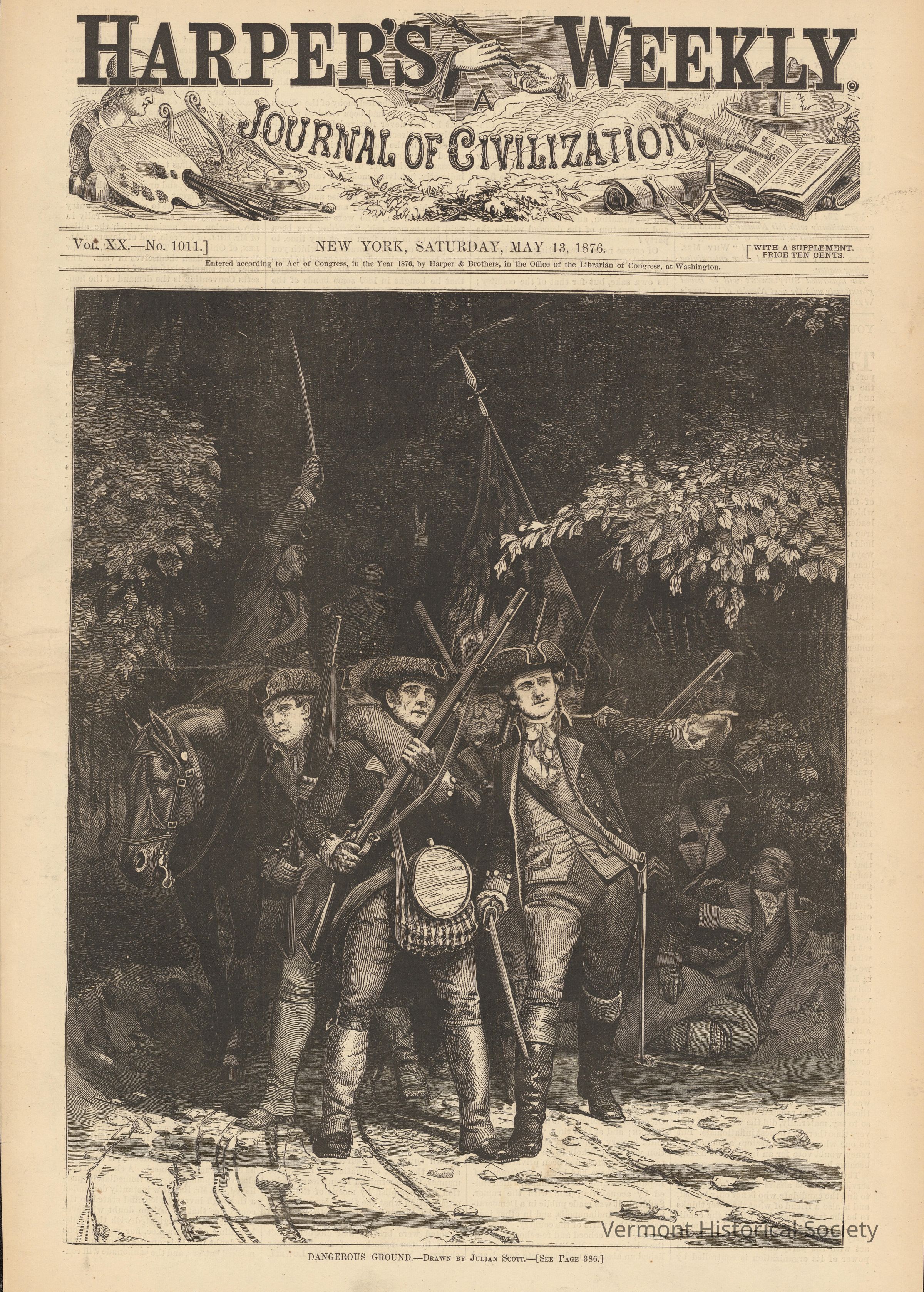 Engraving printed on the cover of "Harper's Weekly". The illustration shows a group of men in 18th-century clothing holding guns and swords. The man at the front right is pointing to the right while leaning to speak to the man at his left. The man at the front left of the group is holding a large canteen, a haversack, and has rolled fabric slung over his chest. In the background of the group, two men on horses are raising their hands to signal to group members further back. An unseen man holds up a large United States flag. At the right, one man is on the ground dying while another comforts him. Beneath the image is the label, "DANGEROUS GROUND.--Drawn by Julian Scott.--[See Page 386.]" The back of the page is printed with 4 columns of political news stories.Acquisition
