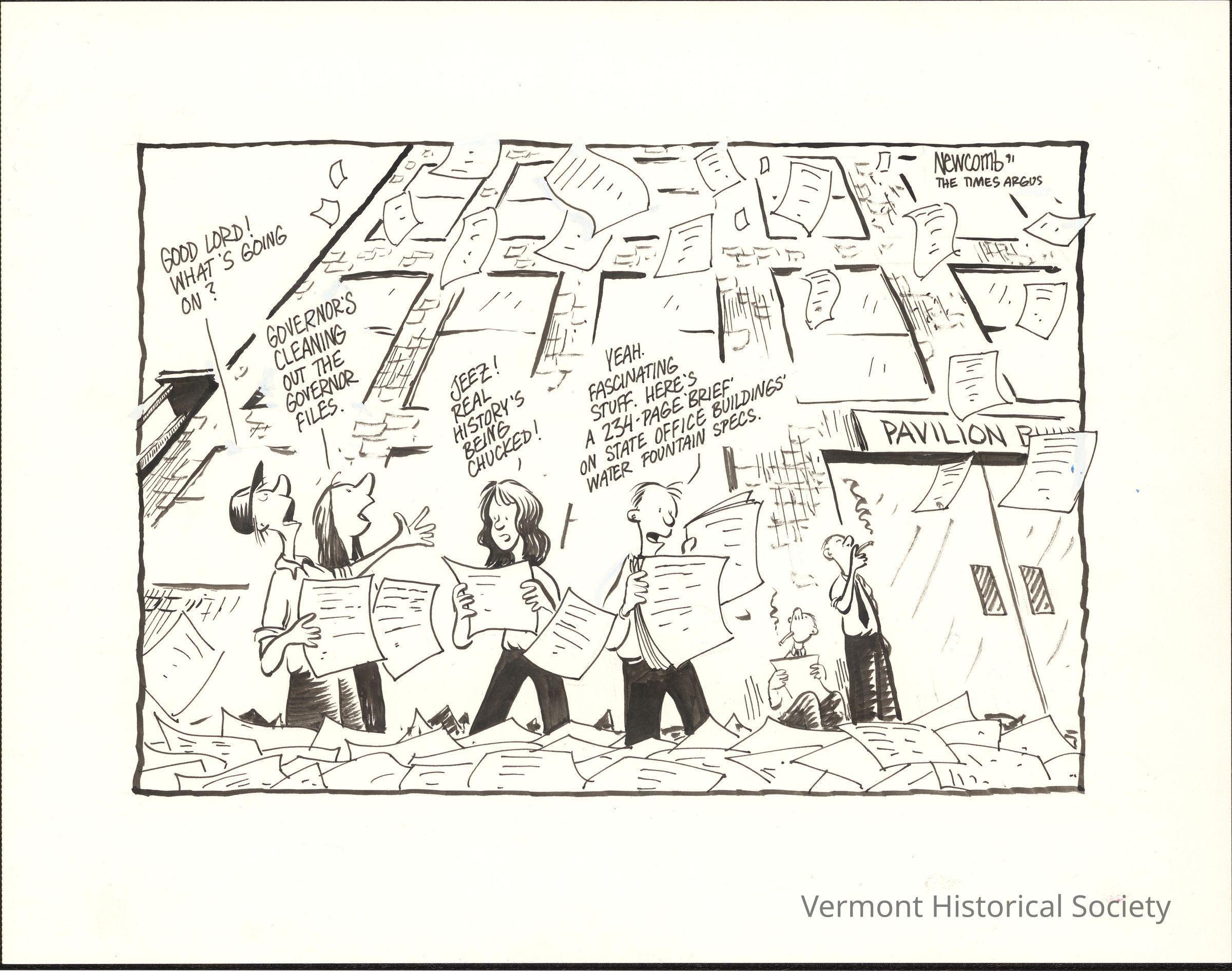 Original hand-drawn political cartoon. The cartoon shows four people standing outside a building labeled "PAVILION BUILD[ING]" in a pile of papers while more papers as more papers fall from the sky. The dialogue of the people explains that the governor is throwing away old papers, which some people think should be saved for history and others think is boring or irrelevant. There are two additional people smoking near the building's door. Some of the linework has been "erased" with white correction fluid. The illustration is signed at the upper right corner, "Newcomb 91 / THE TIMES ARGUS".Type of Drawing