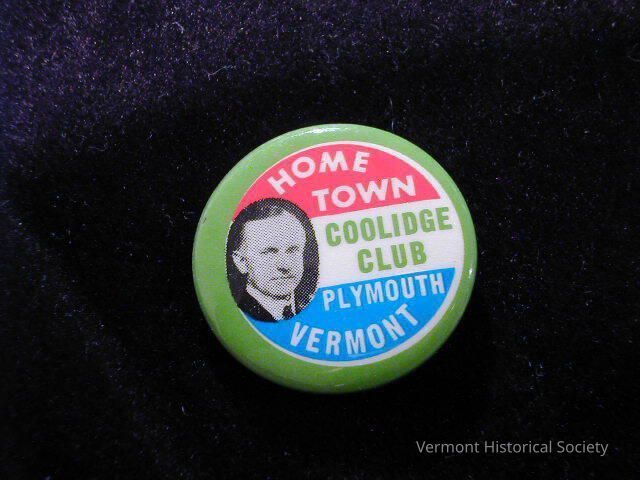 Round metal button with a green border around a red-white-and-blue striped center printed with the words, "HOME TOWN COOLIDGE CLUB PLYMOUTH VERMONT" and a photograph of Calvin Coolidge.