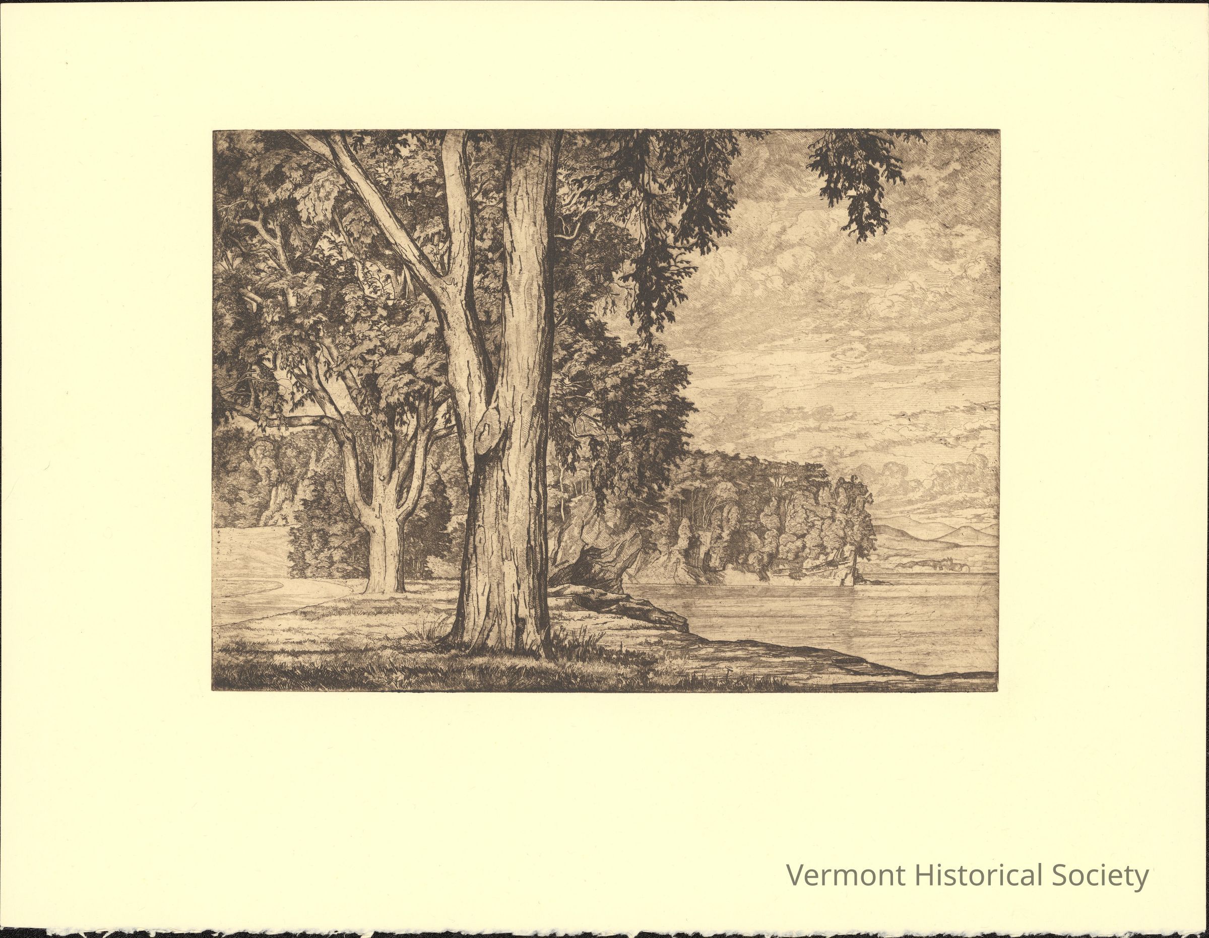 Print showing two large elm trees in a grassy area at the edge of Lake Champlain. There is a small path curving along the left edge. Tree-covered land juts into the water at the middle distance, and low mountains can be seen in the background at the right.