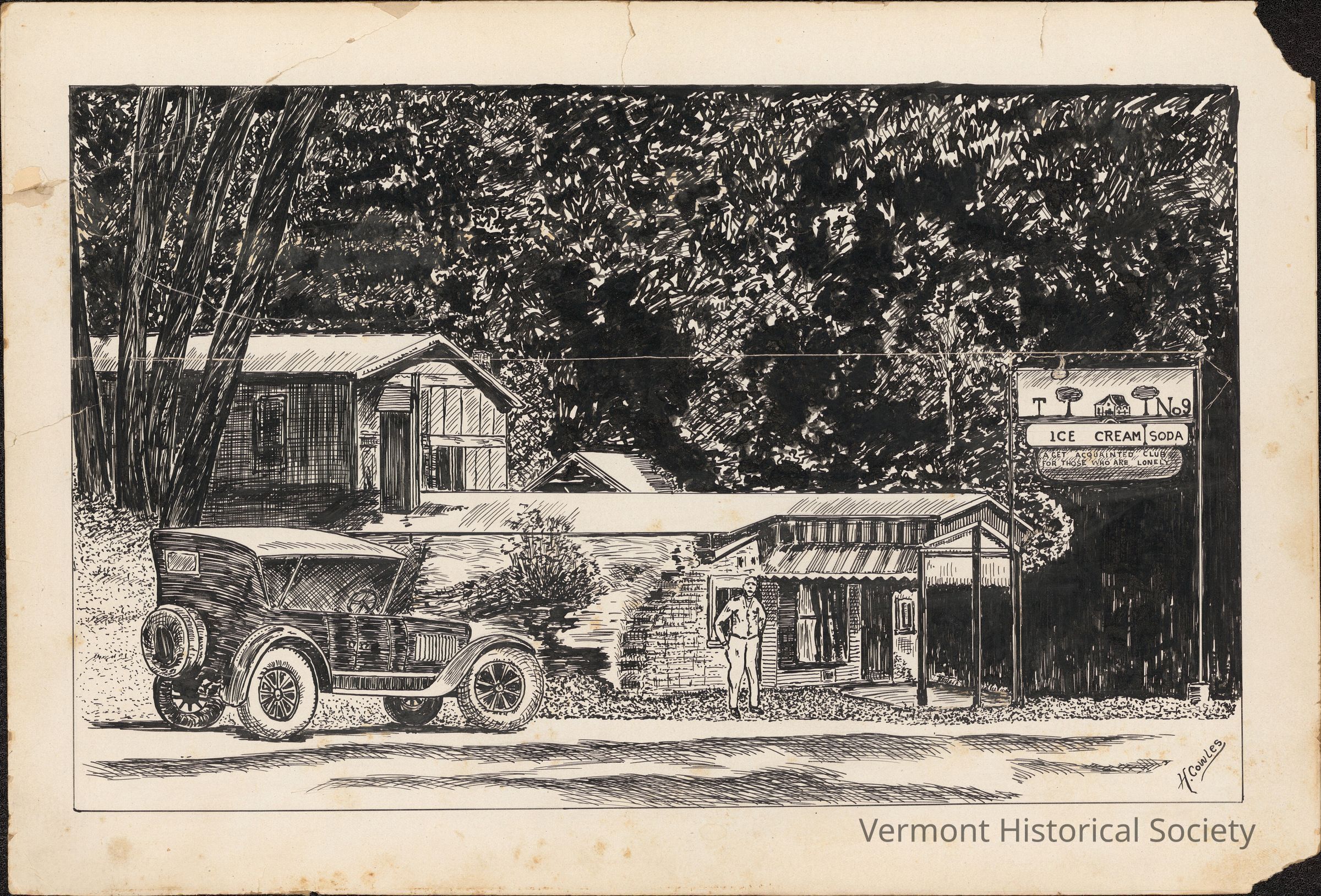 Pin and ink drawing showing a man standing in front of a commercial building near a car. The car is a Model T. The building appears to be built into a hillside with a brick or stone facade. There is an awning extending from the center front over a door and window. A sign by the building shows a house between two trees above the inscription, "ICE CREAM SODA / A GET ACQUAINTED CLUB FOR THOSE WHO ARE LONELY". There is another building behind and above the first, the front door of which appears to open onto the roof of the first building. Another peaked roof is visible behind the first building. The background is covered by thick foliage. The drawing is signed in the lower right corner, "H. Cowles".Type of Drawing