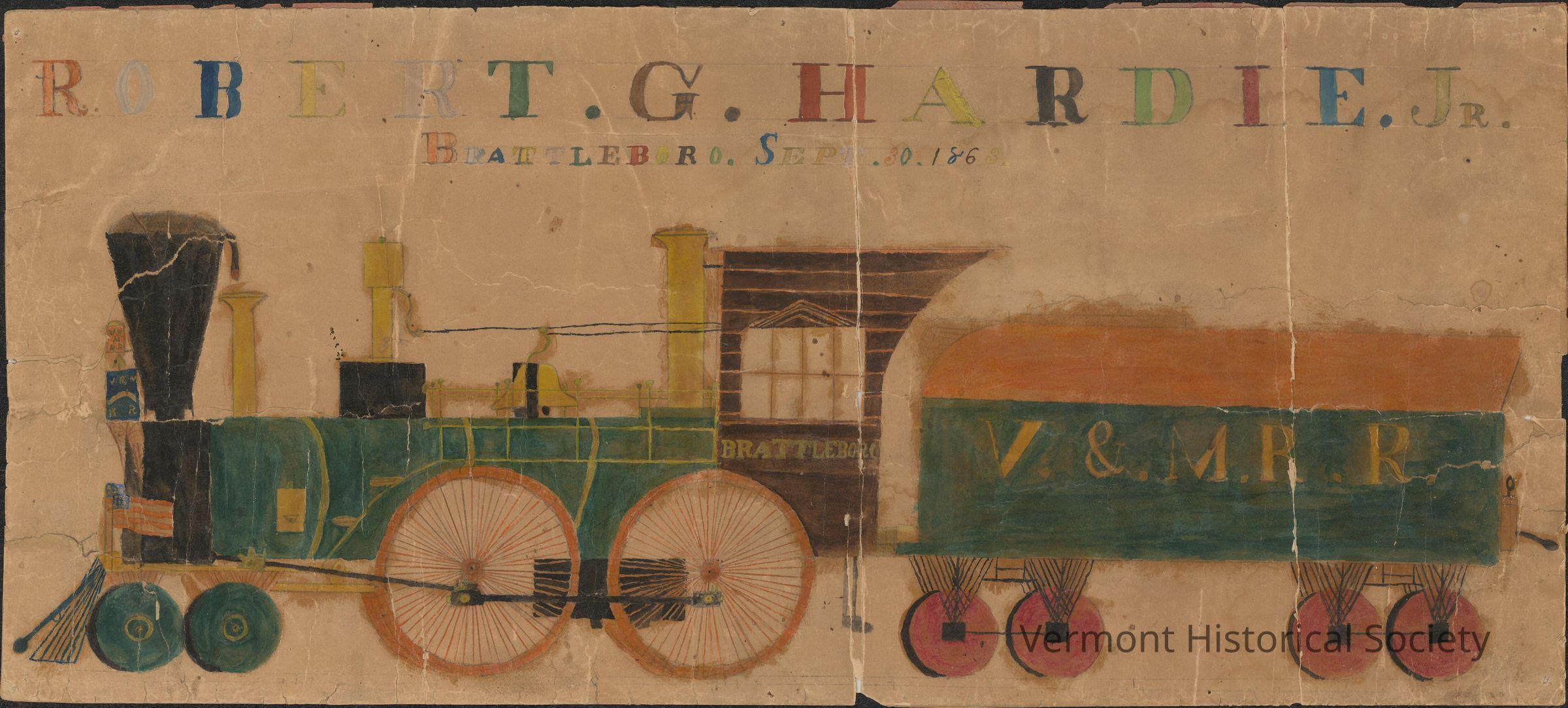 Naive watercolor painting showing a train engine and tender from the side. The engine is painted green with a large front chimney, high orange wheels, and a black cabin labeled, "BRATTLEBORO". The tender is green with an orange top, red wheels, and the yellow label, "V. &. M. R. R." There are two small United States flags at the front of the engine. The top of the image is labeled "ROBERT. G. HARDIE. Jr. / Brattleboro. Sept. 30. 1863." Each letter and number is painted in a different color.Type of Painting