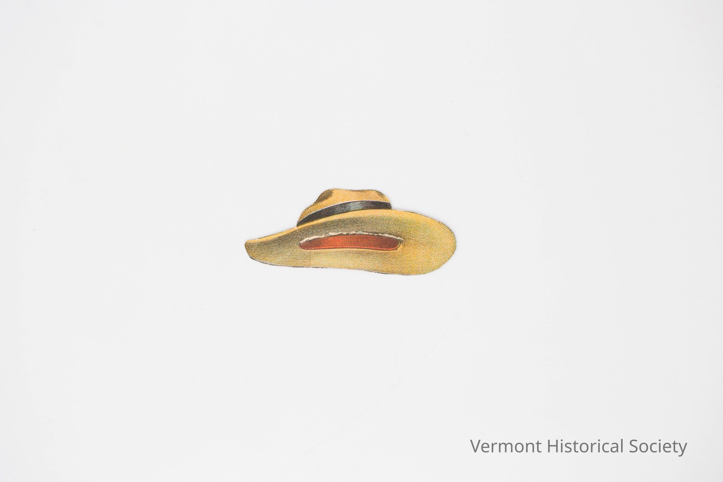 Paper hat for a paper doll. The hat has a wide brim and black band around the base of the crown. There is a horizontal slit in the middle for inserting the doll's head.