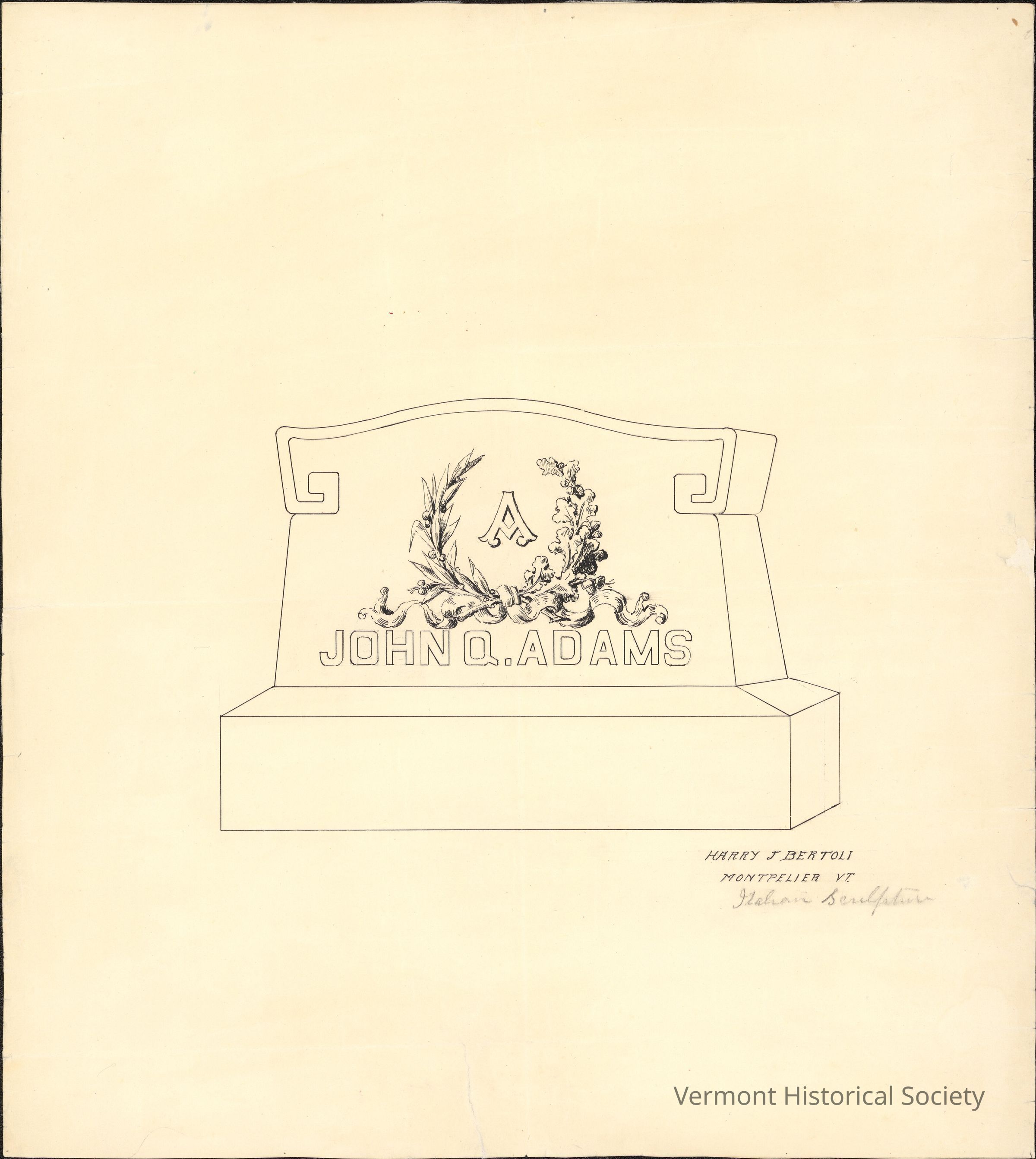 Line drawing of a tombstone. The monument shows a laurel wreath around the letter A with the name "JOHN Q. ADAMS" centered below. It is signed "HARRY J. BERTOLI MONTPELIER VT" to the bottom right of the drawing, with the penciled note, "Italian Sculpture", below.Artwork Details