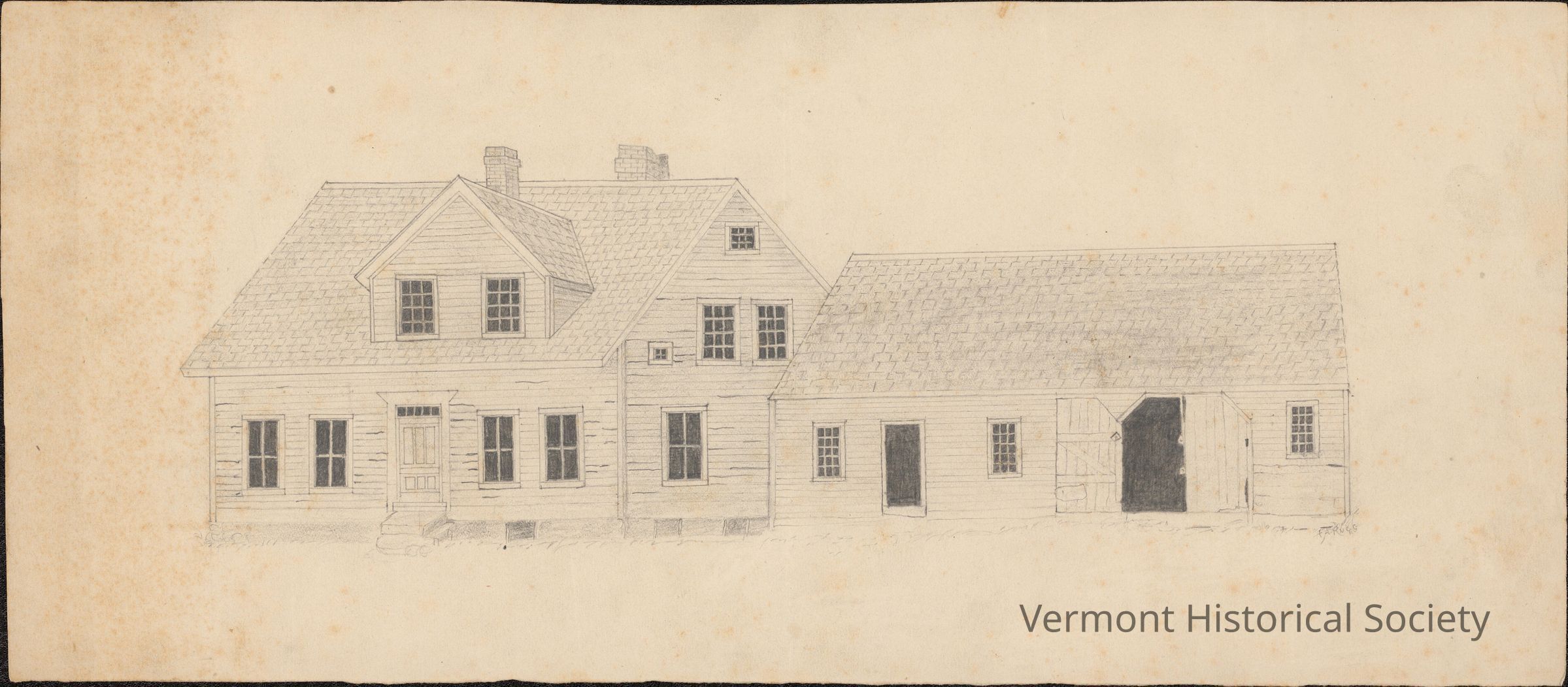 Pencil drawing showing an oblique view of a 1-1/3 story cape-style house with an attached shed or stable. The house is 5 bays wide with a 2-bay dormer at the front. There are two chimneys.Type of Drawing