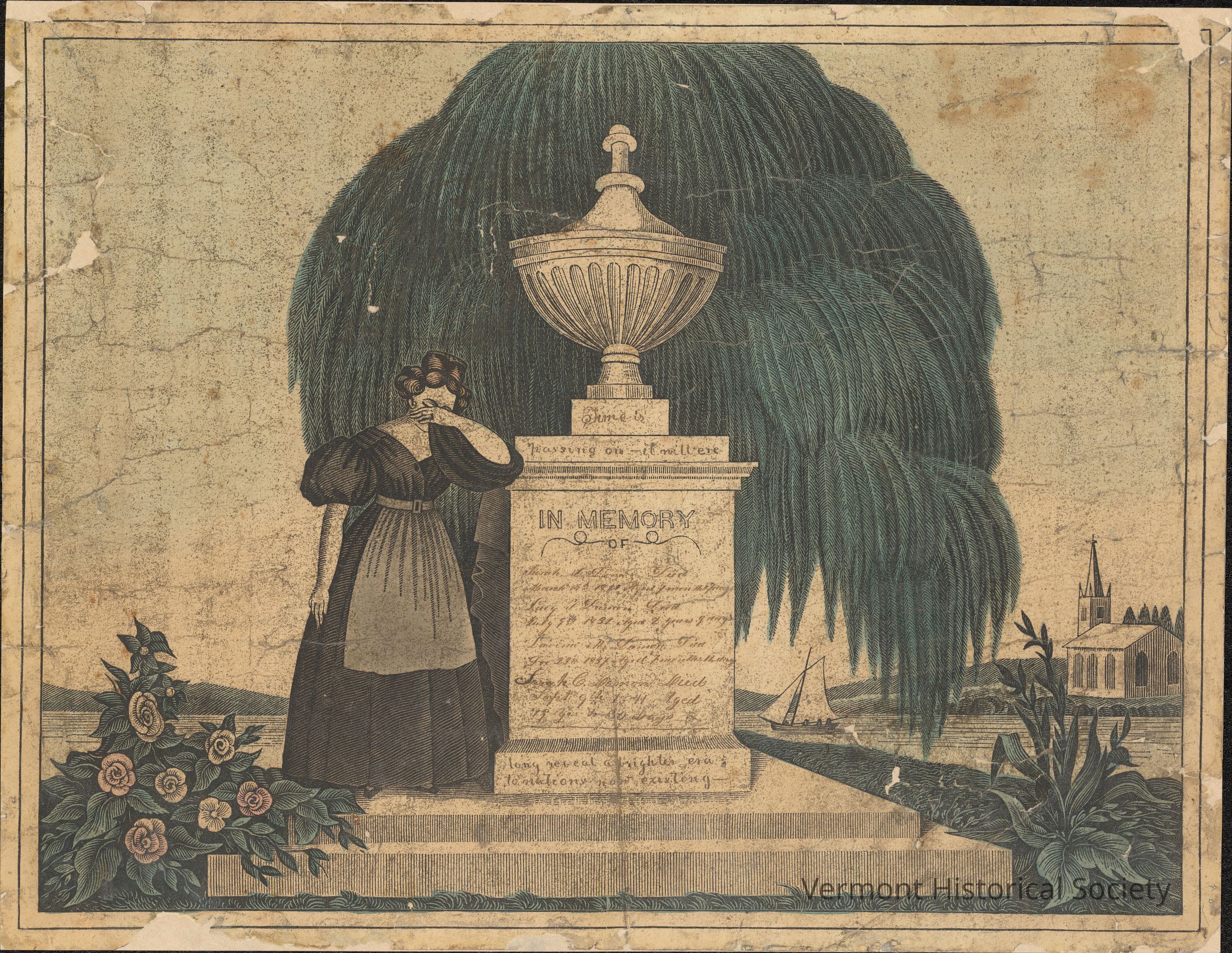 Hand-tinted mourning print showing a large, central plinth topped with an urn. There is a woman in a black dress with voluminous sleeves covering her face with her hand standing to the left of the plinth. There is a weeping willow behind the plinth, a rose bush to the left, and a shrub to the right. A body of water spans the composition behind the scene, and there is a church on the far shore at the right. There is a sailboat in the water just to the right of the plinth, visible under the willow branches. The plinth is printed with the words, "IN MEMORY", and filled with the hand-written inscription, "Time is passing on--it will 'ere / Sarah C. Damon Died March 14th 1821 Aged 7 months 7 days / Lucy T. Damon Died July 7th 1832 Aged 2 years 7 days / Lavina M Damon Died Dec 23d 1837 Aged 7 months 12 days / Sarah C. Damon Died Sept 9th 1841 Aged 19 yrs & 30 days."Acquisition