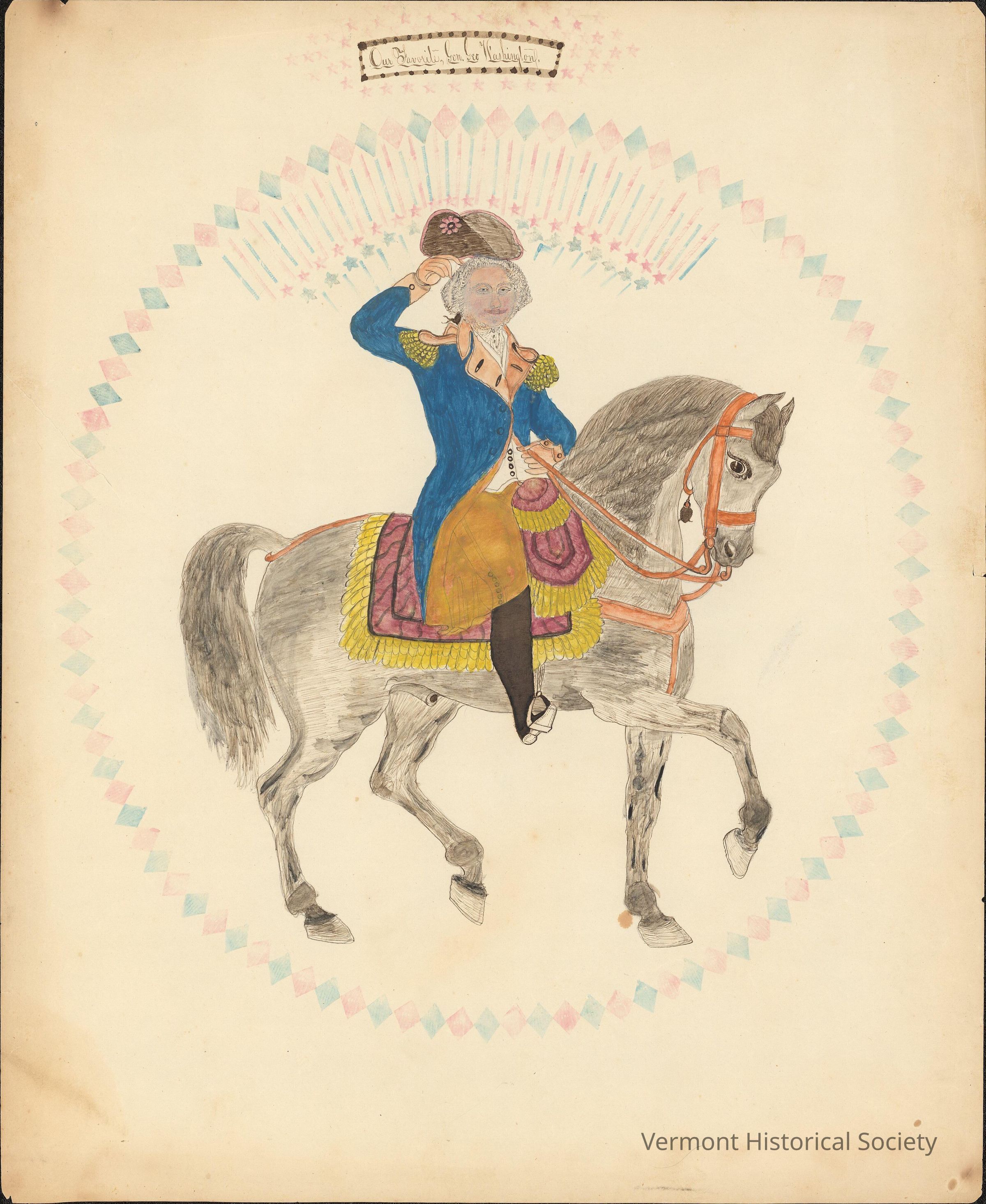 Pen-and-ink drawing colored with watercolors showing a man [George Washington] sitting on a horse. The man has curly white hair and is raising one arm to hold his bicorn hat slightly above his head. He is wearing a long, blue military coat with buff lapels, a white vest, buff breeches, and black, knee-high boots. The saddle and blanket are maroon with yellow tassels. The horse is grey with a buff-colored bridle. The image is encircled by diamond-shaped stamps in pale blue and pink watercolor, with stamped lines and stars added to the top quarter of the circle. Above the circle is inked title, "Our Favorite, Gen. Geo Washington," surrounded by stamped stars.Artwork Details