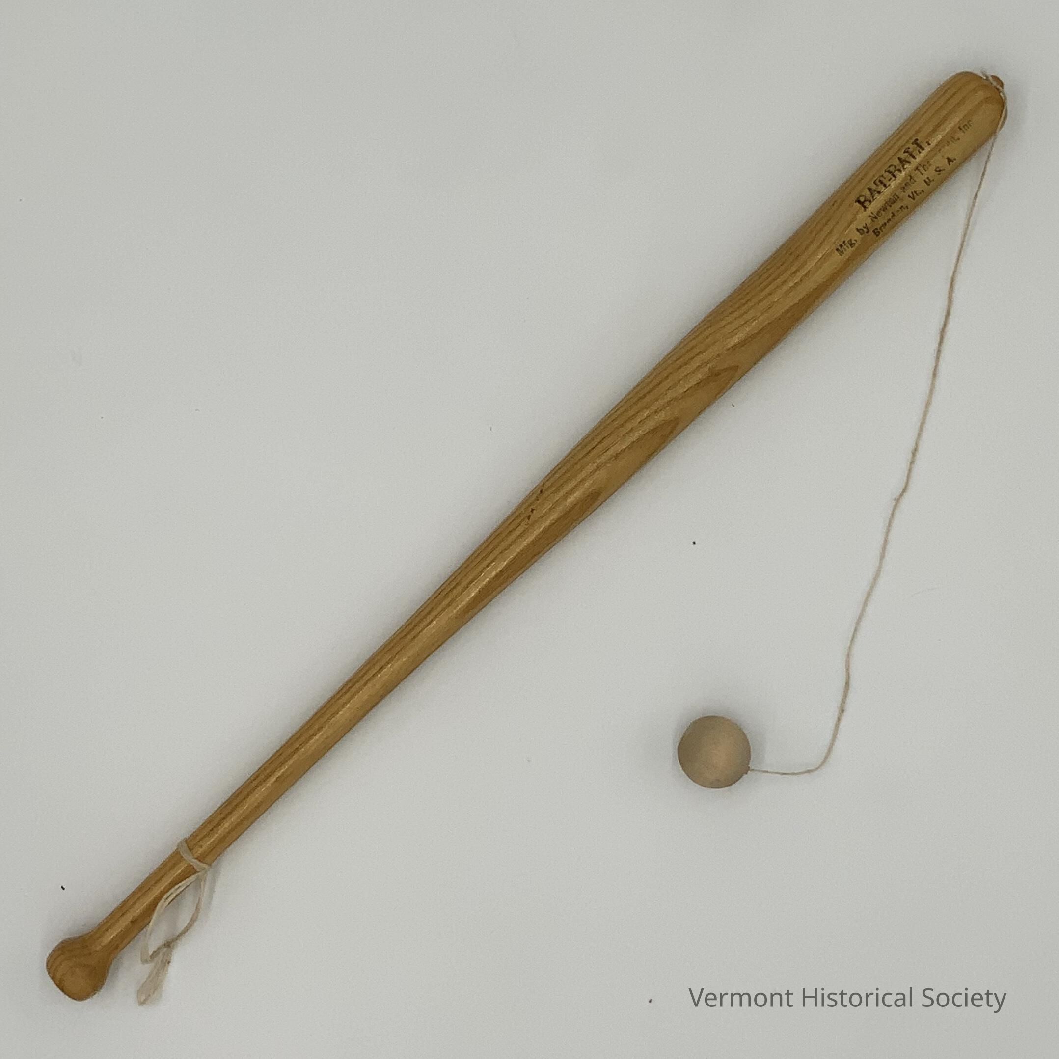 Small baseball bat with attached ball. The child-sized bat is turned from light-colored wood with pronounced graining. An small, applied wooden knob at the top of the bat secures a length of string which attaches a small wooden ball on the other end. The bat is labeled "BAT-BAT.T./Mfg. by Newton and Thompson, inc/Brandon, Vt., U. S. A."Context