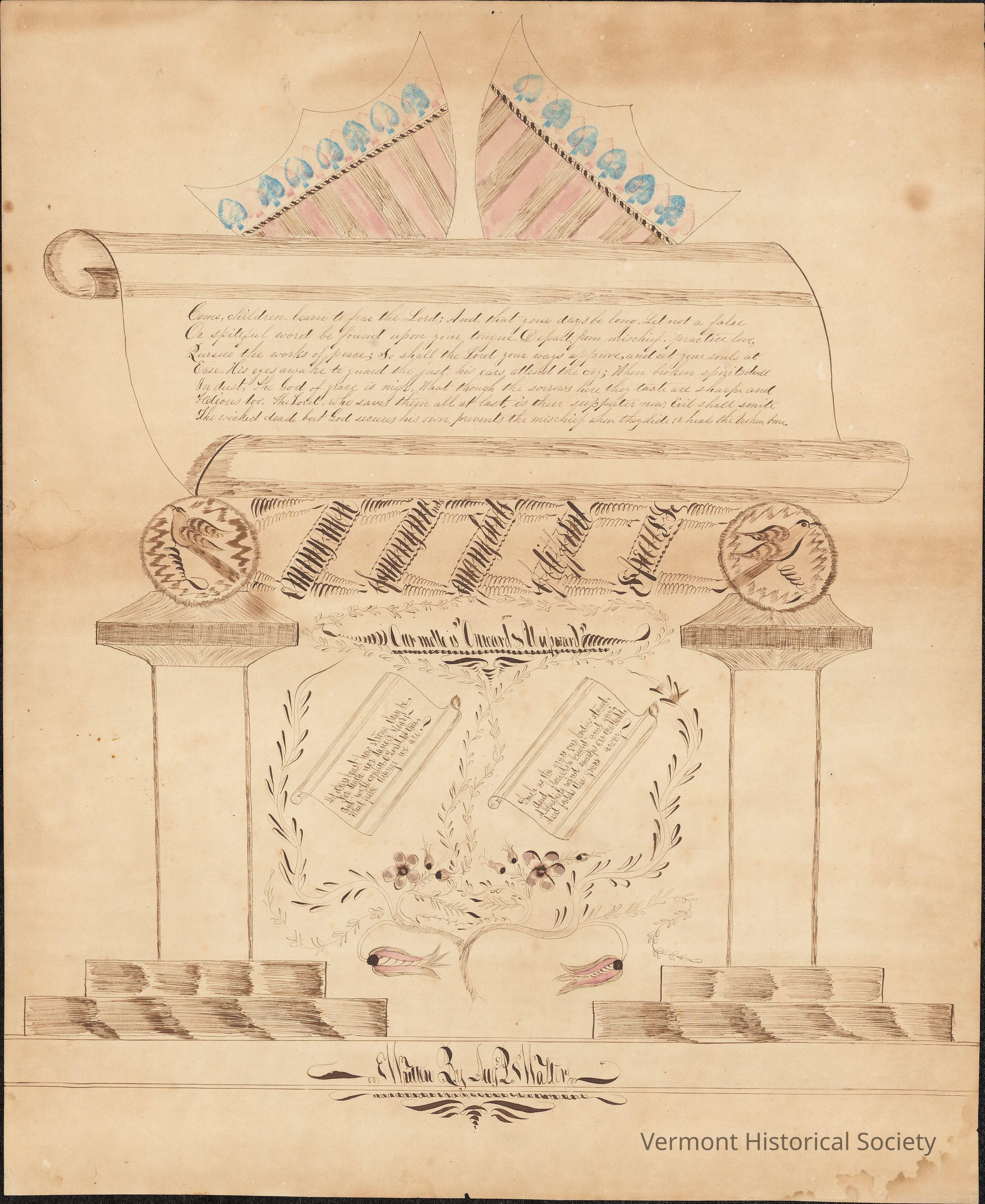 Inked drawing showing a scroll sitting atop two pillars. There are two federal shields above the scroll, with pink watercolor stripes and pink and blue spade stamps in place of the stars. The scroll is inscribed with the text of the hymn, "Com, Children, Learn to Fear the Lord", but Isaac Watts. Beneath the scroll is horizontal bar or pillar wrapped with the words, "many men / of many minds / many birds / of different / species &c" between two round medallions decorated with birds. Between the two vertical pillars at the base is a floral vine encircling the decoratively written phrase, 'Our motto is "Onwards & Upward"'. Between the vines are two diagonal scrolls inscribed with the first two verses of the hymn, "Let Others Boast How Strong They Be" by Isaac Watts. The center bottom is signed, "Written By Aug P. Walter".Artwork Details
