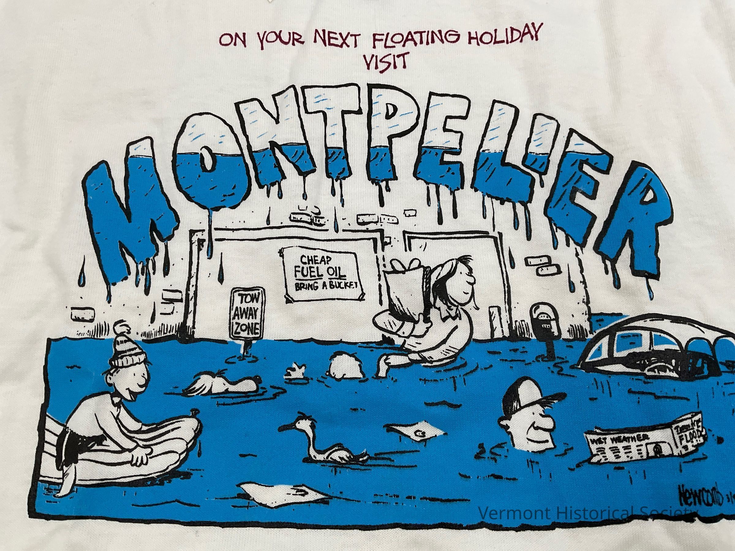 White cotton t-shirt, printed on the front in black and blue with an illustration of people walking through floodwater. The illustration is done in a comic style. The bottom half of the illustration is shaded blue. There is a woman at the center holding a grocery bag out of the water and holding the hand of a child who is submerged in the water up to his nose. There is a dog swimming near the child and a duck swimming near the dog. There is a child on a inflatable raft at the bottom left. There is a man’s head sticking out of the water at the bottom right who is reading the top of a newspaper that is otherwise submerged. He is in front of a submerged car near a parking meter. A brick building in the back has a sign that reads “CHEAP FUEL OIL BRING A BUCKET!” The words “ON YOUR NEXT FLOATING HOLIDAY VISIT MONTPELIER” span the top, and the word Montpelier is in large letters that are shaded halfway to appear flooded.