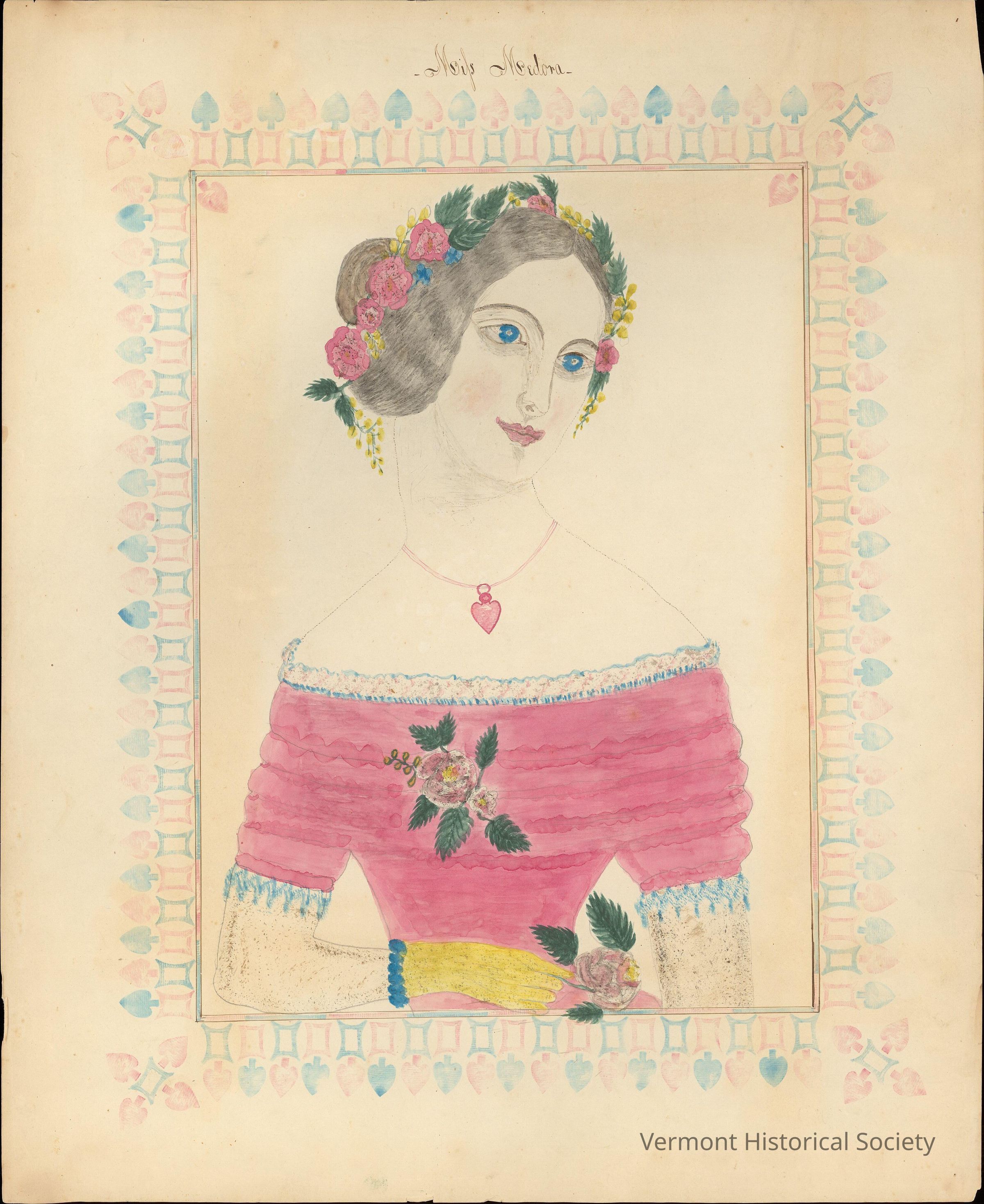 Ink and watercolor portrait of a young woman wearing a pink dress. The woman has straight brown hair worn in a bun at the back of her head with a wreath of flowers on her head. She has large blue eye and is tilting her head to the right. Her dress is off the shoulder and painted in layers to depict ruffles. There is a rose at the center of the bustline, and she is holding a rose in her left hand, which is wearing a yellow glove. The portrait is bordered by a stamped frame of pale blue and pink rectangles and spades. The top center is labeled, "Miss Medora".Context