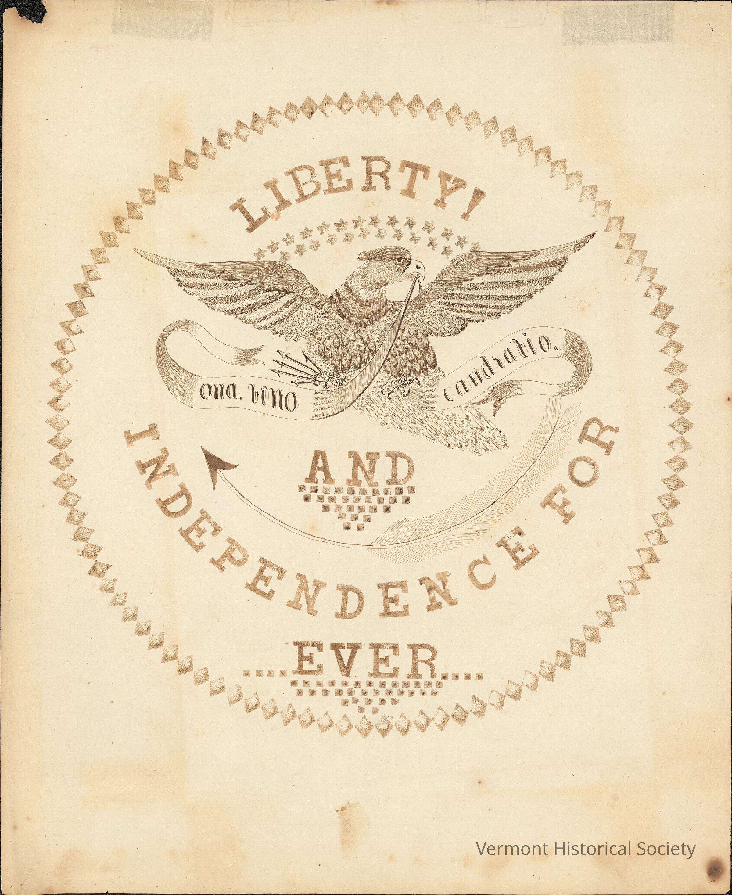 Drawing showing an eagle carrying a banner and arrows surrounded by the words, "LIBERTY! AND INDEPENDENCE FOR EVER". The eagle is drawn with ink, and the banner reads, "ona veno candravio". The surrounding words are stamped, as are the stars arching over the eagle, the squares under the words, and the diamonds forming the circular frame.Context