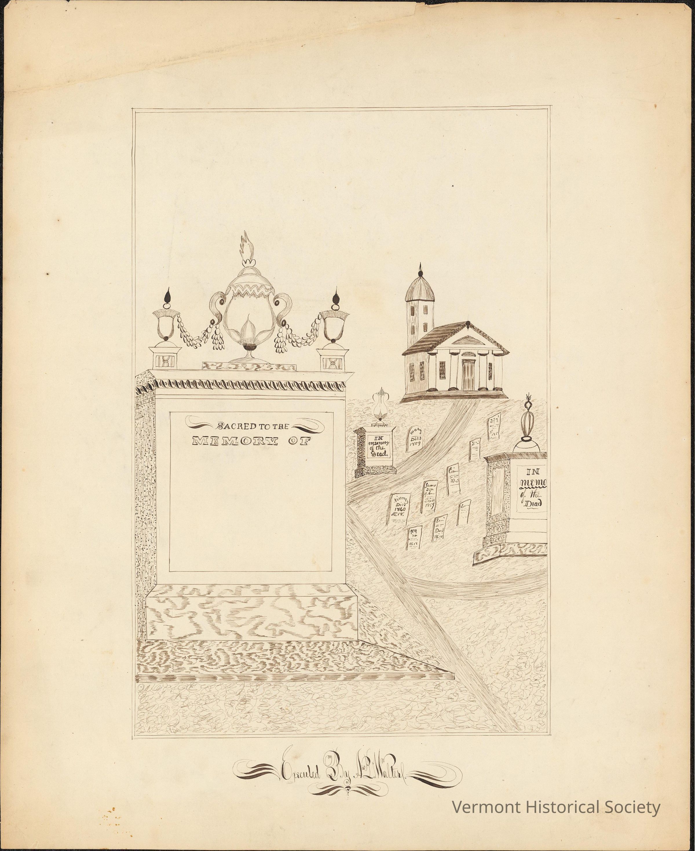 Landscape drawing showing a cemetery on a hill with a building (likely a church) at its summit. In the left foreground is a large plinth with the words, "SACRED TO THE MEMORY OF", on the front above a large, blank area. Two other large monuments can be seen in the middleground that each read, "IN memory of the Dead". There are 9 headstones, some of which have legible inscriptions. From the bottom, the legible portions read, "Wm. Son AE 18"; "S-- Died AE 10"/ "Snow"; "Ninney Died 1860 AE 18."; "James son of A--- Died 1859"; "Cin--". The bottom center of the page is labeled, "Executed By A. P. Walter", in fancy script.Context