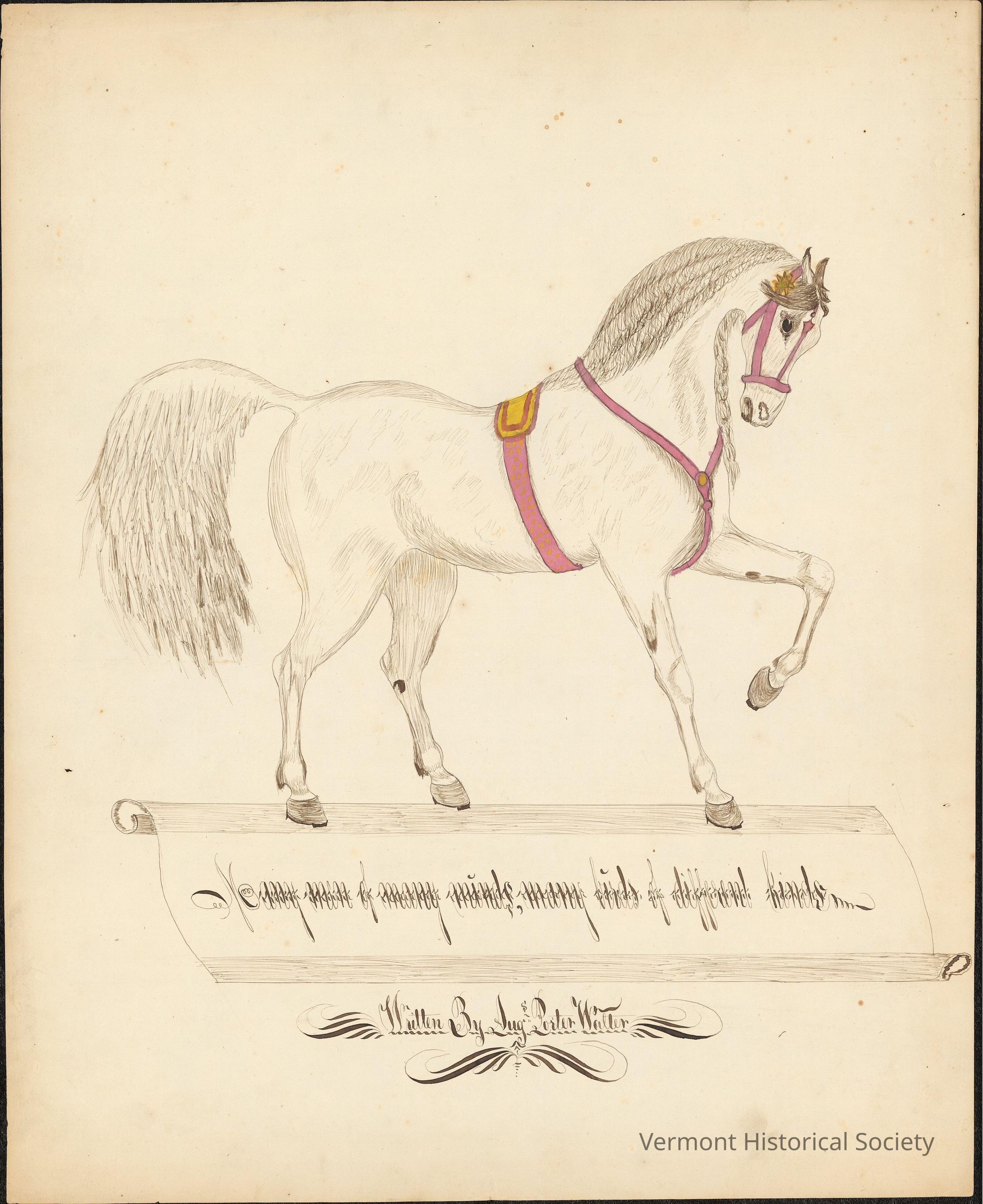 Inked drawing showing a white horse standing on a scroll. The horse is wearing a pink harness and bridle, colored with watercolors. On the scroll is the inked inscription, "Many men of many minds, many birds of different kinds". The inscription is embellished with leaves attached to every vertical line. At the center bottom is the label, "Written By Aug.s Porter Walter", in fancy script.Artwork Details