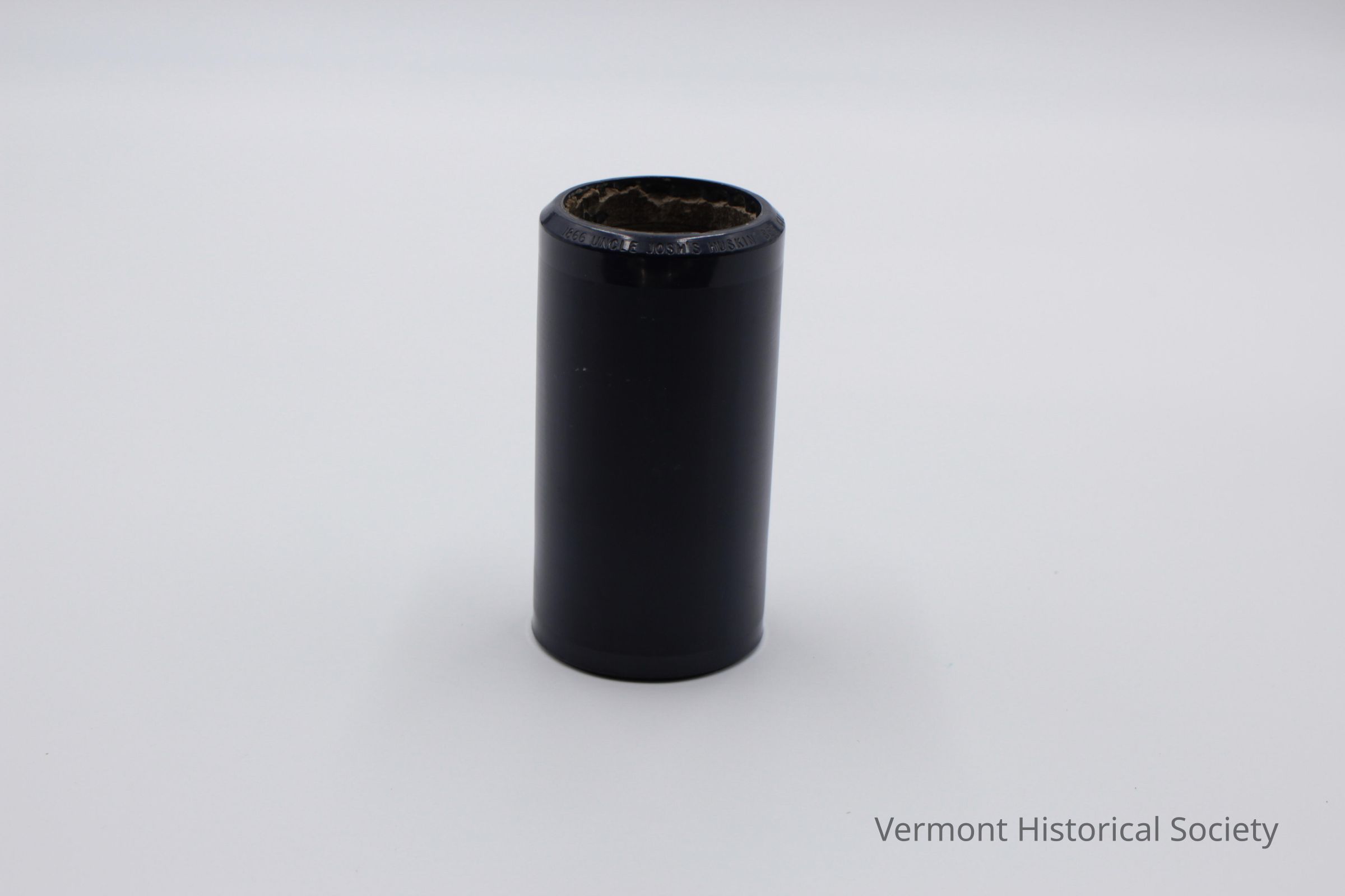 Blue phonograph cylinder with a cardboard case. The cylinder, or "record", is a hollow cylinder consisting of hard, blue, ridged celluloid around a concrete core. One edge of the cylinder is labeled in white with the words, "1866 UNCLE JOSH'S HUSKIN' BEE CAL STEWART & CO. / Thomas A Edison PAT'D. 24".Use