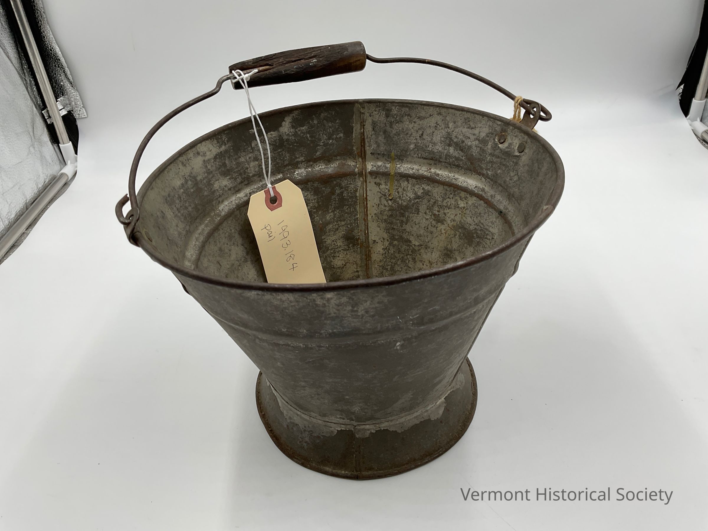 Tin pail. The pail has straight, flared sides from a narrow, round base. The handle is heavy-gauge wire with a turned wooden grip at the center. The handle is attached to the pail through metal eyelets at the rim.Context