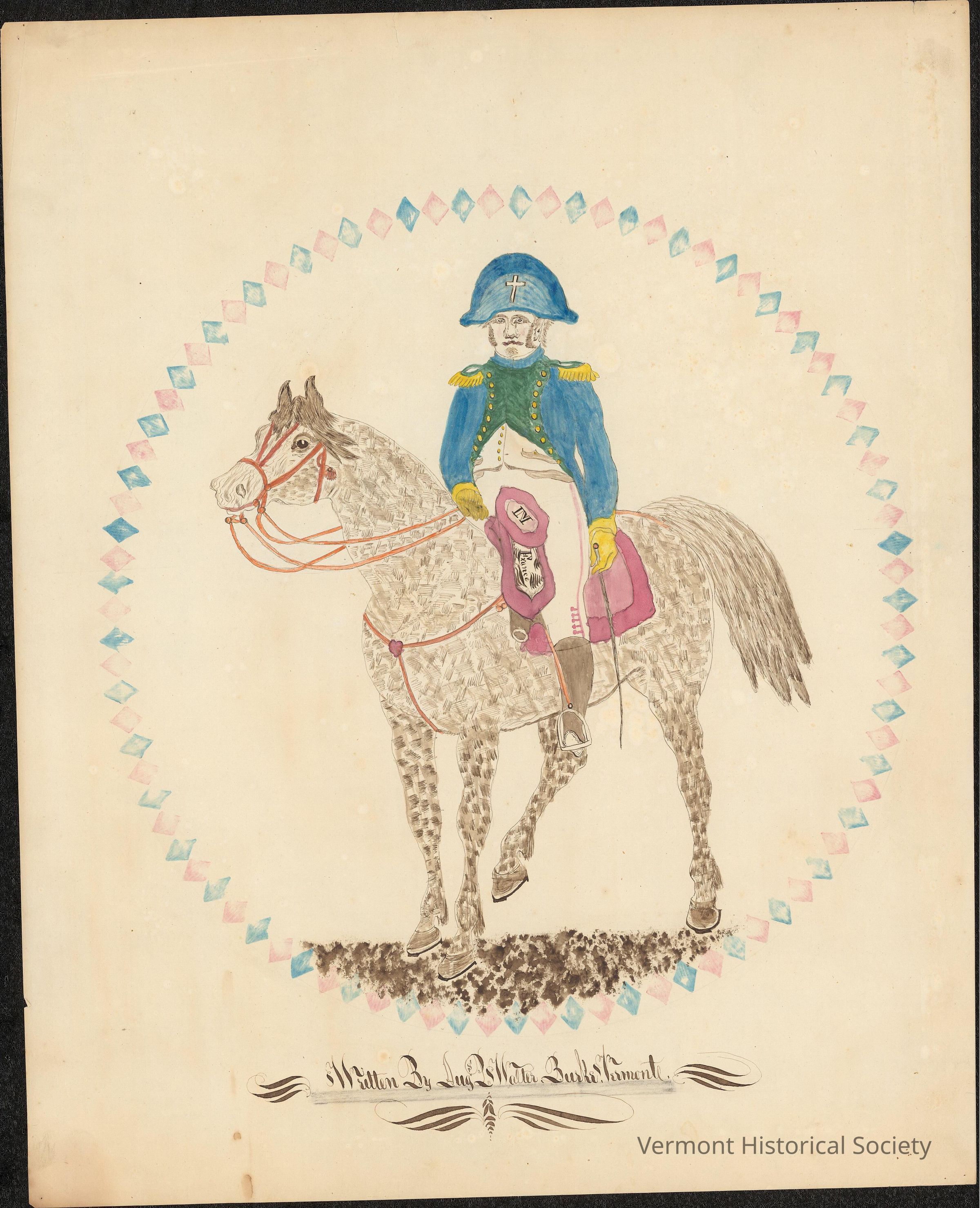 Ink and watercolor drawing showing a man (Napoleon) on a brown spotted horse. The man is wearing a blue bicorn hat, a blue and green military coat, white breeches, and brown knee-high boots. The saddle, blanket, and bridle are pink, and the words, "IN France" are written on the saddle. The horse's spots are created by crosshatching in a basketweave pattern. The drawing is framed within a circle made of diamond-shaped pink and blue stamps. The bottom is labeled, "Written by Aug.s P. Walter. Burke. Vermont.", in decorative script.Artwork Details