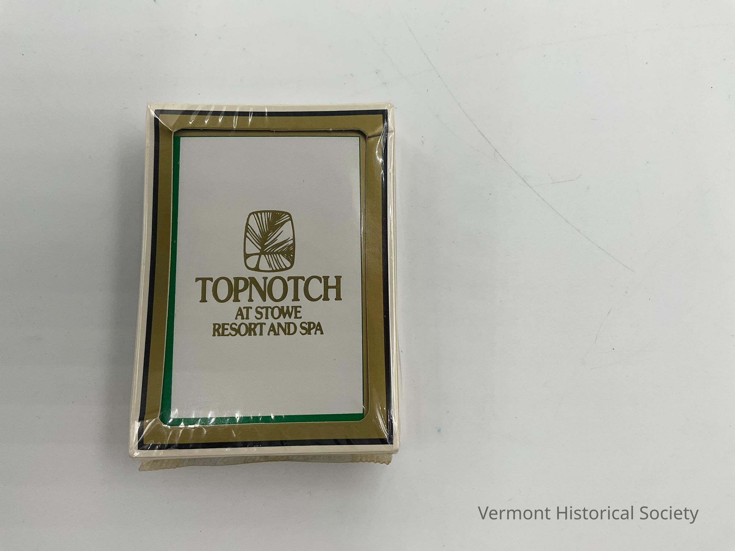 Gold, black and white box containing playing cards. The box has a window into the actual cards that shows the promotional logo for "Topnotch at Stowe Resort and Spa." On one of the box are the words"Gemaco, Trademark of Quality in Playing Cards." On the other, "Gemaco Poker." On one side, "Playing Cards, Made in U.S.A." On the other, "Plastic Coated."Context