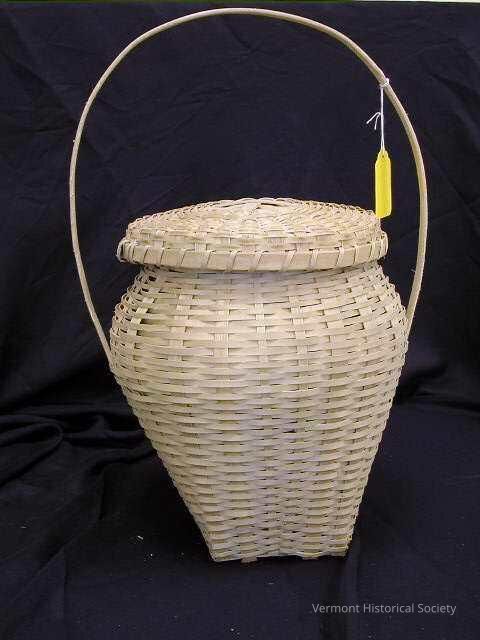 Urn-shaped basket of woven brown ash split. The body of the basket is very narrow at the base, flaring outward dramatically to the top quarter, the curving back inward. The lid is a shallow round, significantly larger than the basket's opening. The rigid, stationery handle attaches to the basket at the widest point.Context