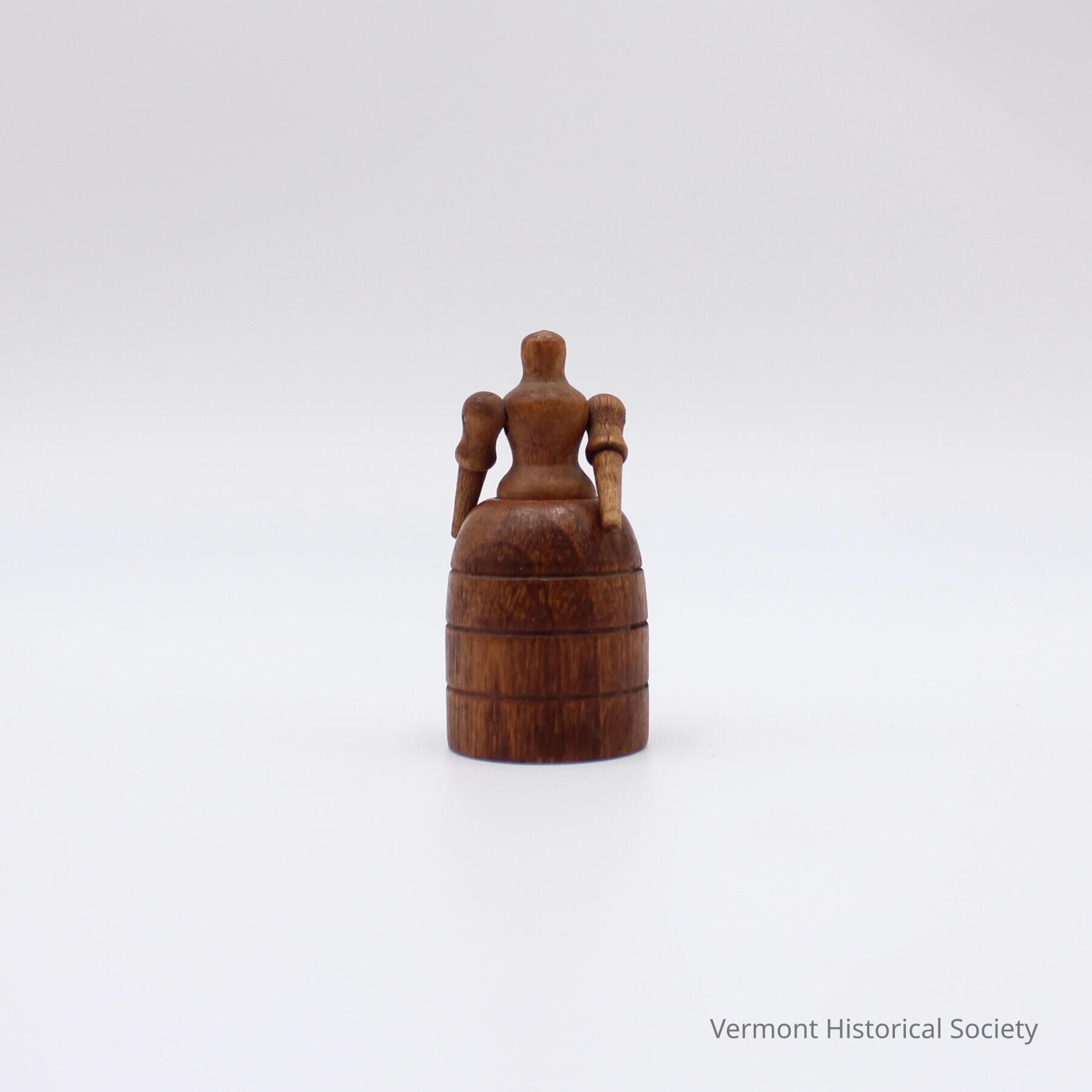 Trinket box in the shape of a woman. The box is cylindrical. The lid is made of turned pieces of wood: a vasiform peg form the body and head, and two drumstick-shaped pieces form the arms.