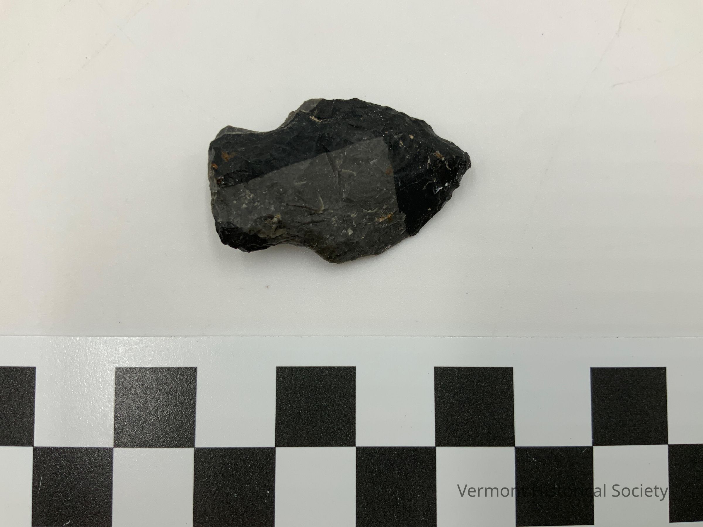 Black chipped stone projectile point with an expanding stem. It has bifacial secondary chipping, and a flat thinned base. It is symmetrical with excurvate blade edges and a biconvex cross section.