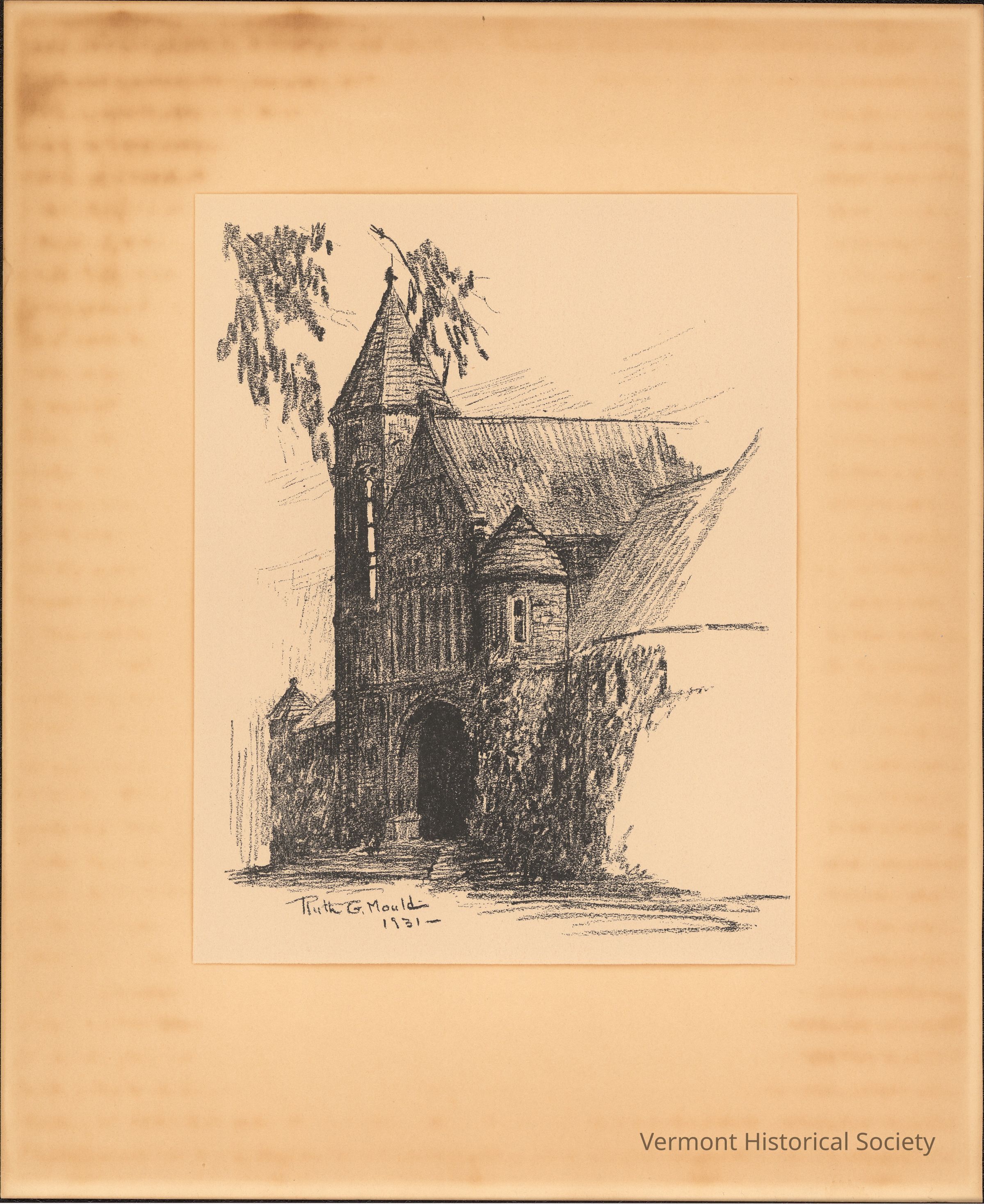 Lithographic print of a sketch showing a gothic style building. The building has a central peaked roof with a tower at each side of the front wall; the left tower is higher than the roof while the right tower is shorter. There is a large arch at the center of the front wall. It is signed, "Ruth G. Mould 1931-".Artwork Details