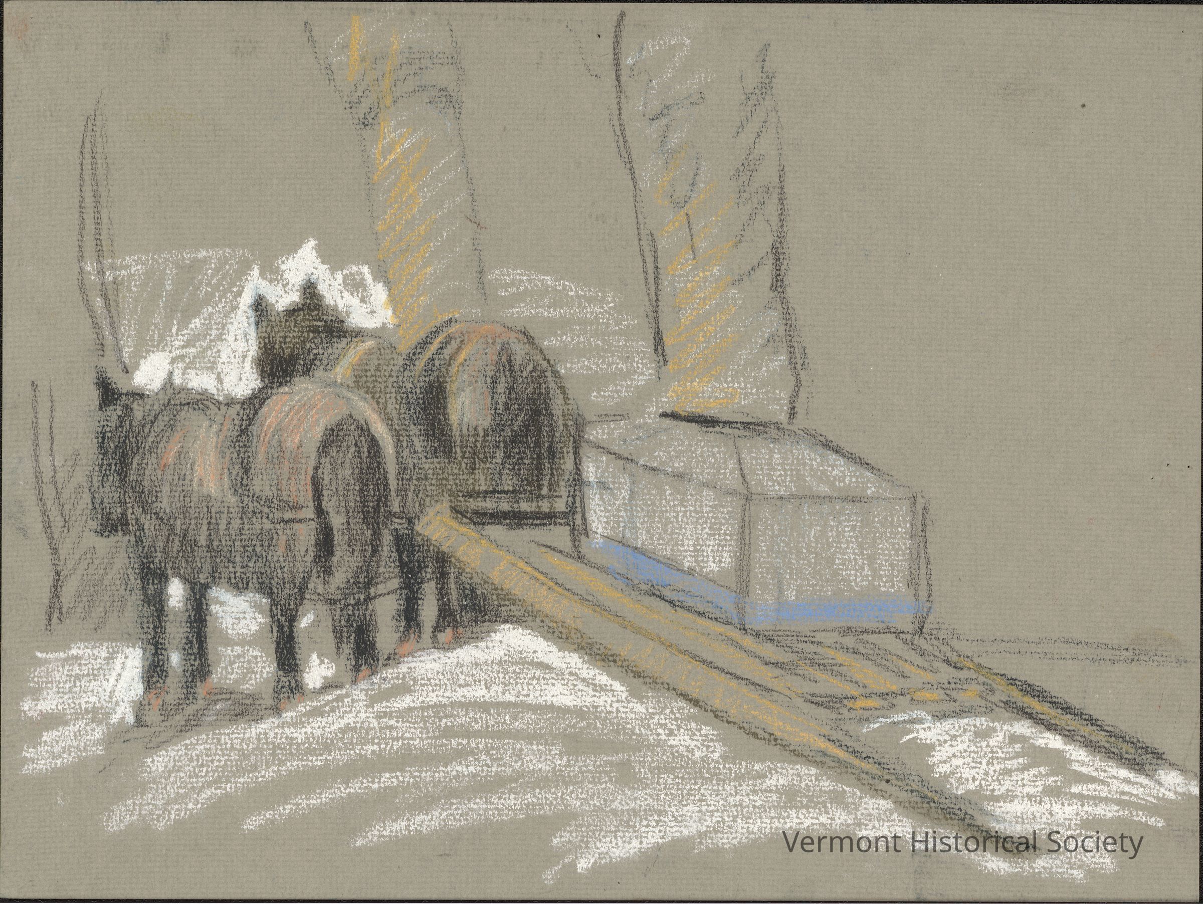 Pastel drawing showing two horses pulling a cart with a large box on it over snow. The cart has no wheels and no visible skates/rails. The box has a slightly domed top with white sides and a blue stripe around the base. There are two trees to the right of the group.Acquisition