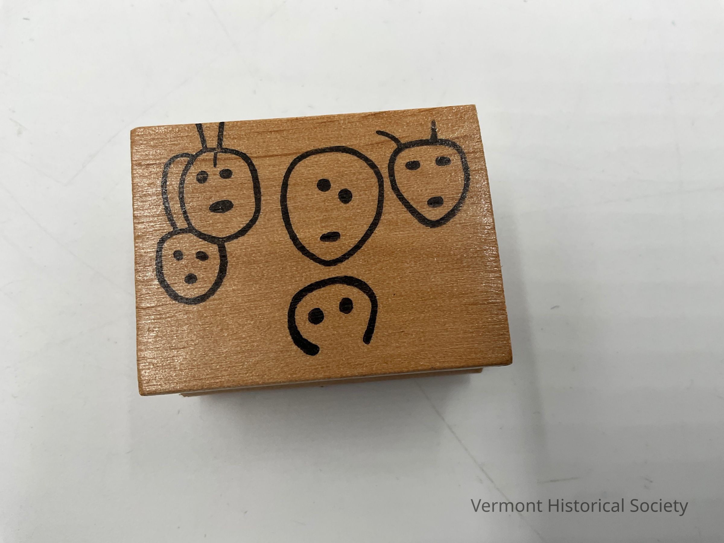 Rubber stamp affixed to a wooden block. The block is printed with five faces two of which have antennas or hair.