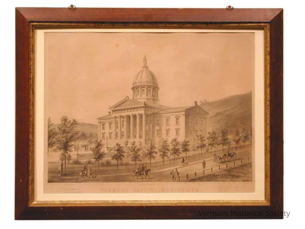 Lithograph print showing the Vermont State House behind a wide, tree-lined road with several pedestrians and travelers on horseback or carriage. The building is a neoclassical building with a two-story, five-column colonnade and a tall cupola surmounted by a female figure.Artwork Details