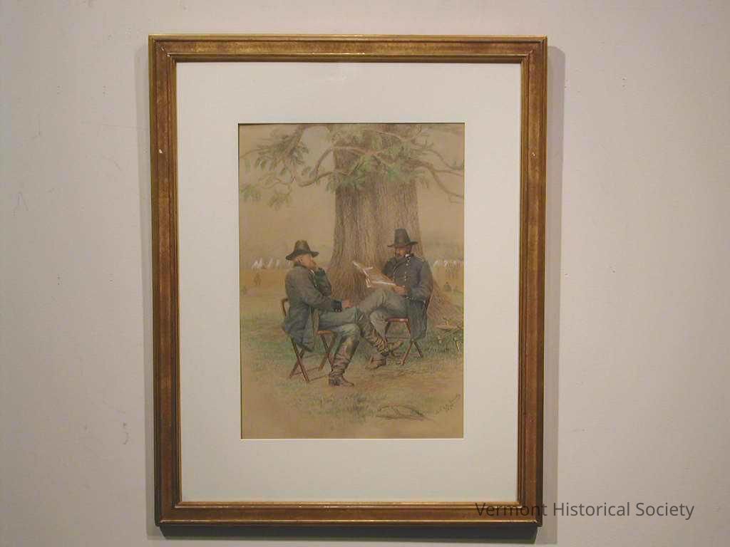 Landscape. Large tree in center, 2 men in uniform seated in front, one man reading newspaper, camp with white tents and people in background. Branch on ground lower right corner.Type of Drawing