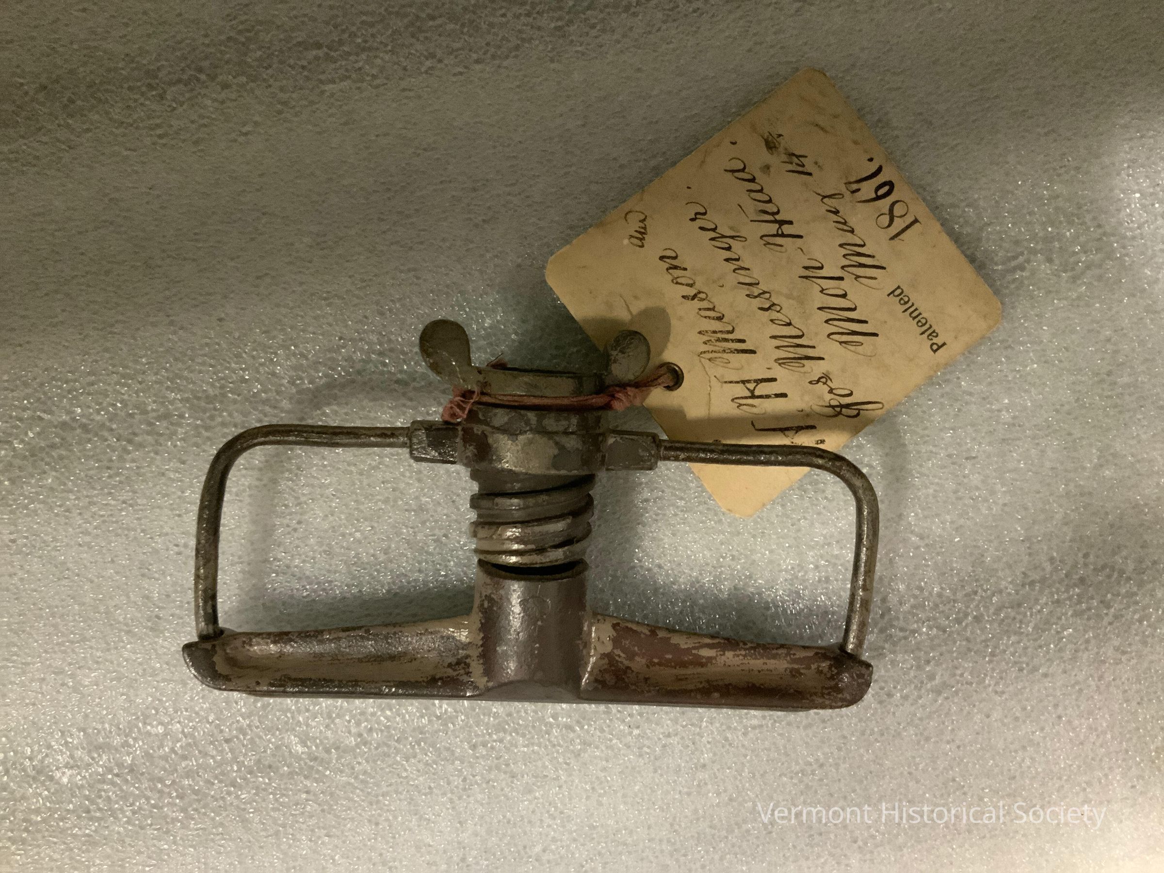 Patent model - mop head. Iron frame composed of screw at top to attach to mop handle, which when tightened closes a shaped bar down onto a heavy wire rim. Rags or other materials would be tightened into place by this screw action. Accompanying tag verifies this as Patent No. 64,683 registered by H.H. Mason and Jos. Messinger of Springfield, VT on May 14, 1867. See Gifts and Loans for papers.