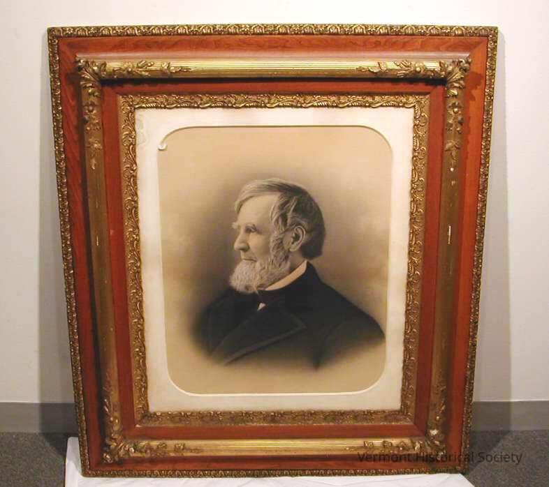 Crayon enlargement portrait of man with a white bear facing to the left. He is wearing a black suit. The portrait is beneath a white frame within and wood and gilt frame.