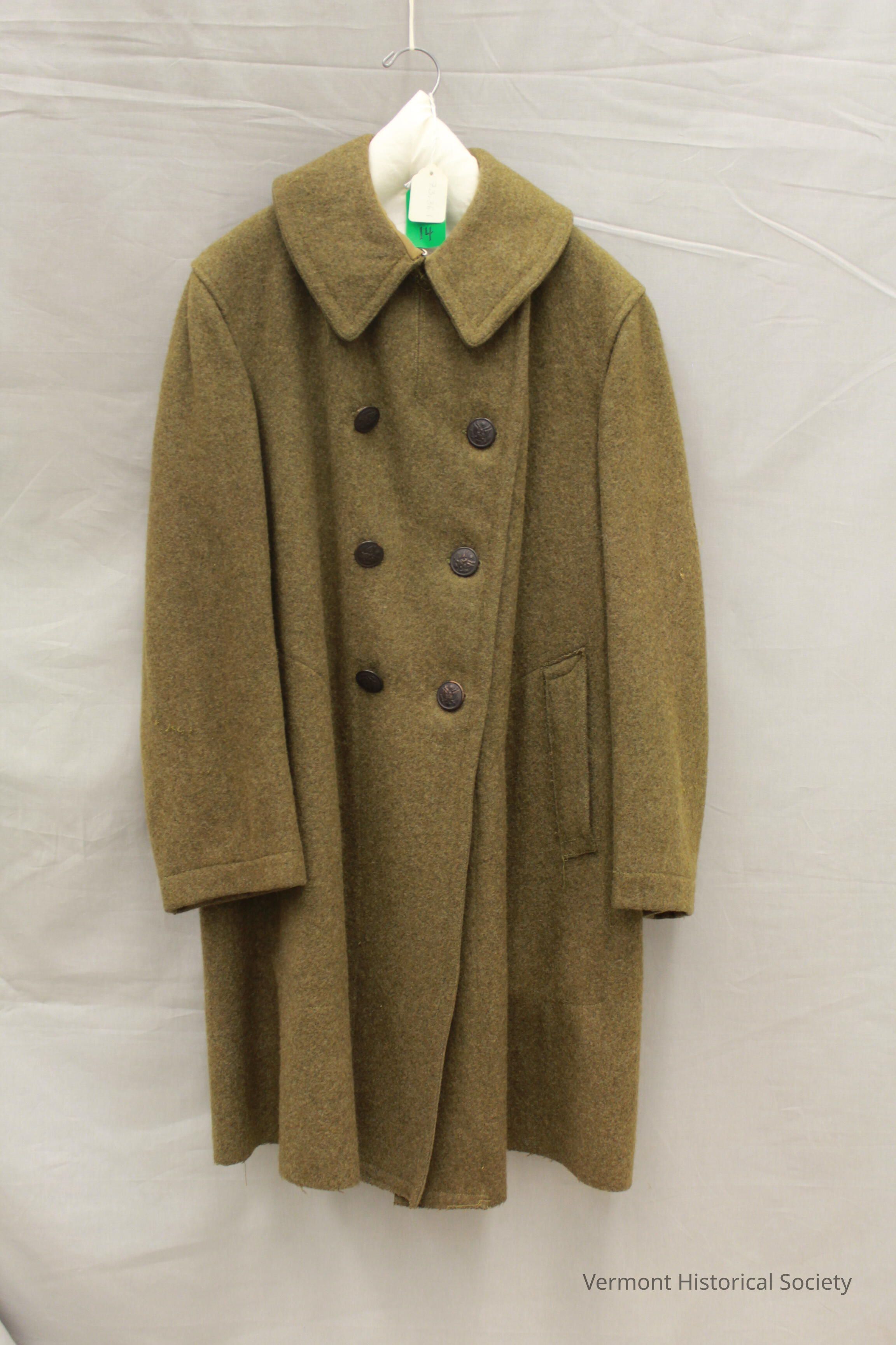 Double-breasted, khaki uniform overcoat with metal buttons. The buttons are molded with an eagle design. The upper portion of the coat is lined in cotton, and there are two large pockets on the inside. The back of the neck has a red stamp with the label "US". The bottom edge is left raw and unhemmed.Context