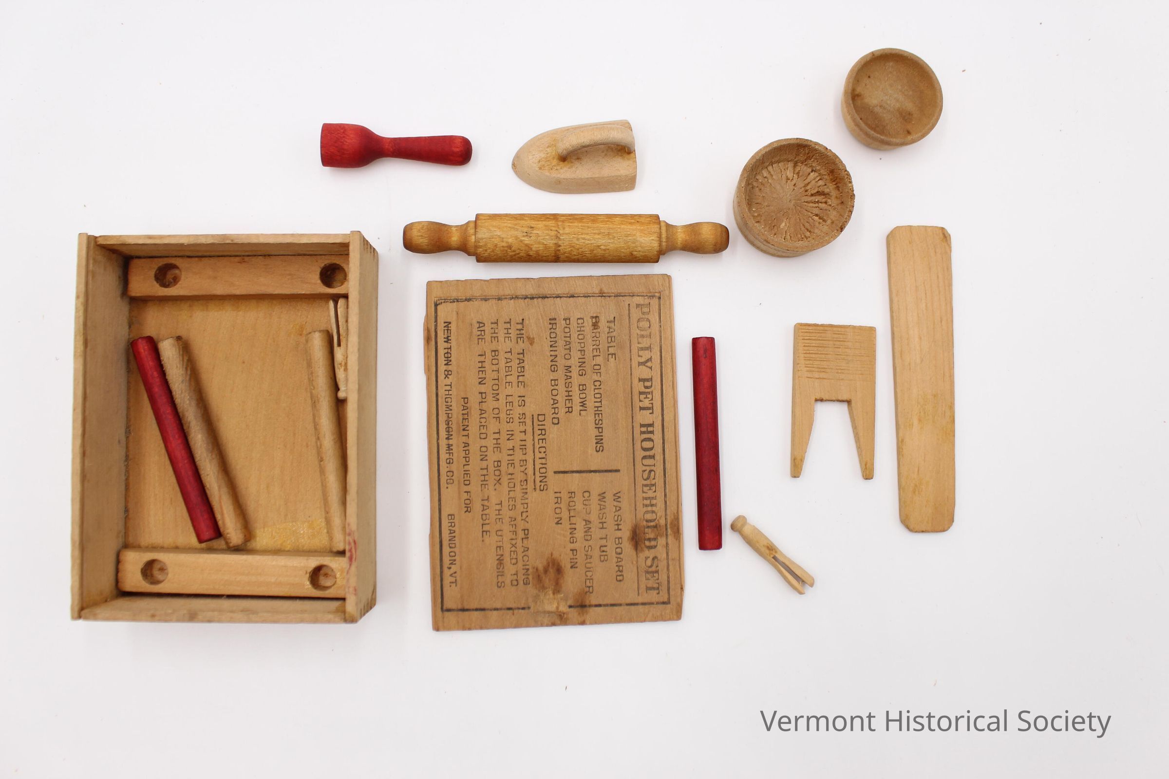 Box containing miniature wooden laundry and kitchen tools. The box uses four dowels to become a table for the set. The miniatures include a rolling pin, an iron, a potato masher, two tubs, a portion of an ironing board, and two miniature clothespins. The lid of the box is printed with the name of the set ("POLLY PET HOUSEHOLD SET"), a list of contents, and instructions.Context