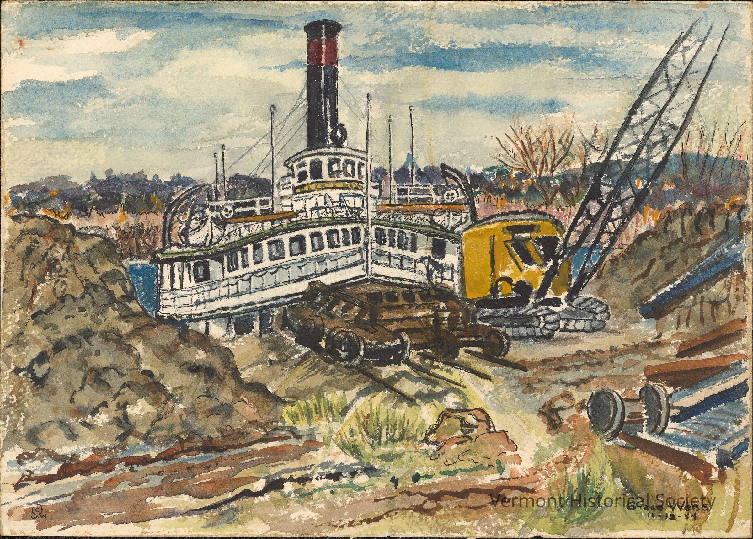 Shows the transportation of the Ticonderoga to the Shelburne Museum.Acquisition