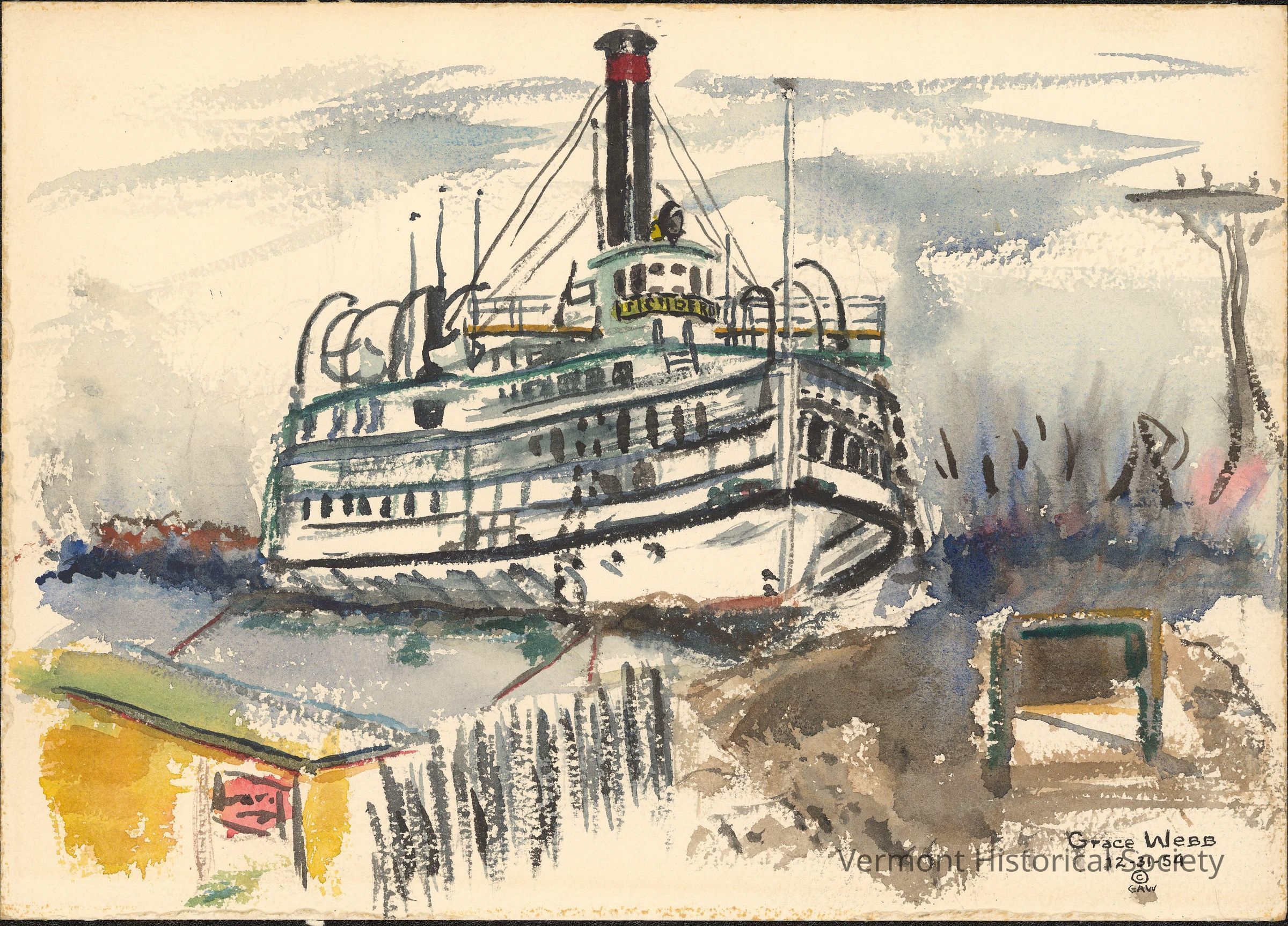 Watercolor painting showing a large, white steamboat. The boat has several levels and a single, black chimney. It has the name label "Ticonderoga" on the front of the uppermost level. The boat is shown either in water alongside land, or already on the land alongside water. There a yellow building at the lower left, a sign at the lower right, and an electrical or telephone pole at the right edge.Context