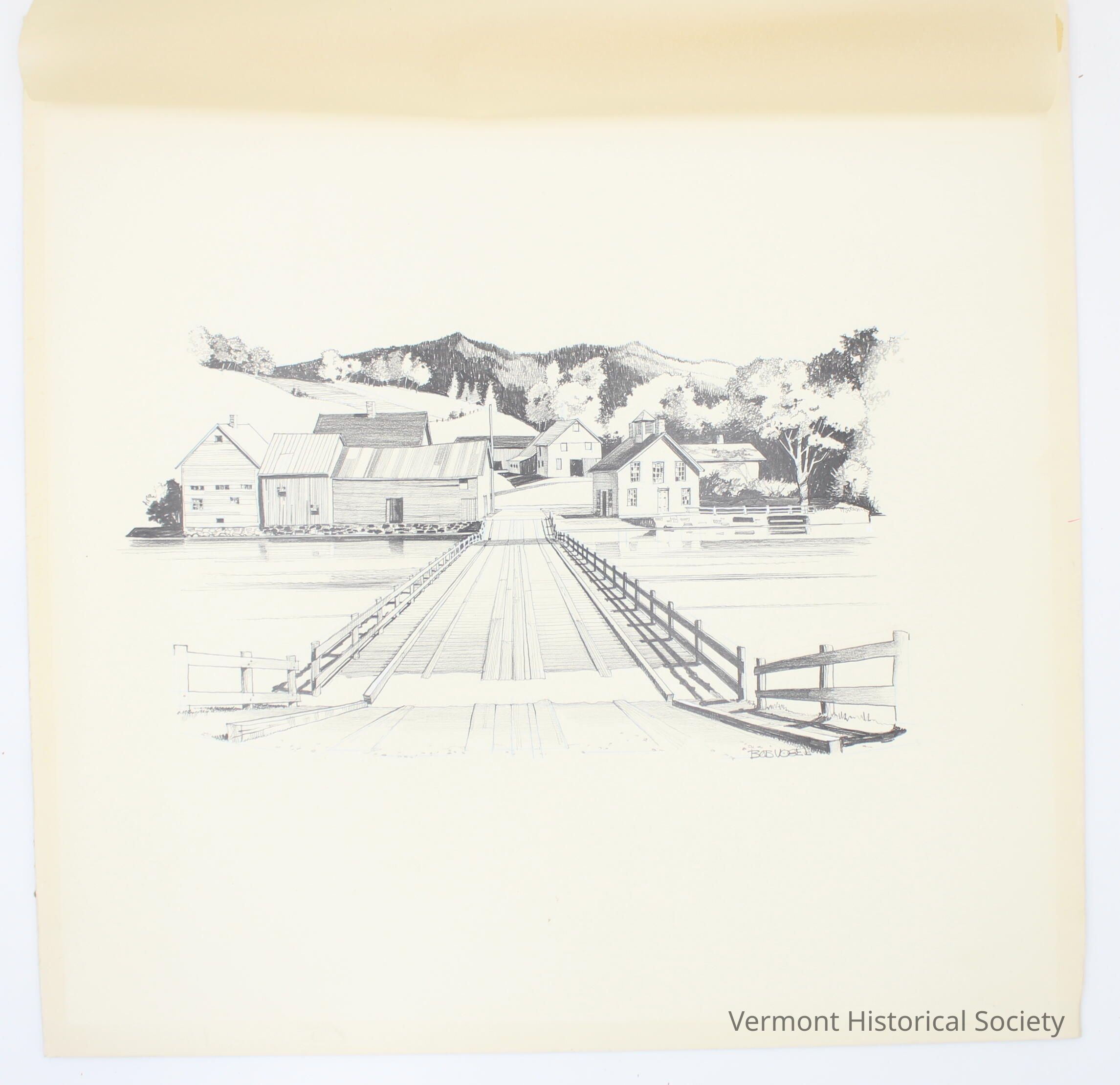 Drawing on board showing a wooden bridge leading to a small town. The buildings in the top directly abut the river over a rock wall. Mountains are in the background. A sheet of tissue paper has been taped at the top of the image to fall over it as protection, and bears the label, "BROOKFIELD." The drawing is signed at the lower right corner, "BOB VOGEL"Type of Drawing