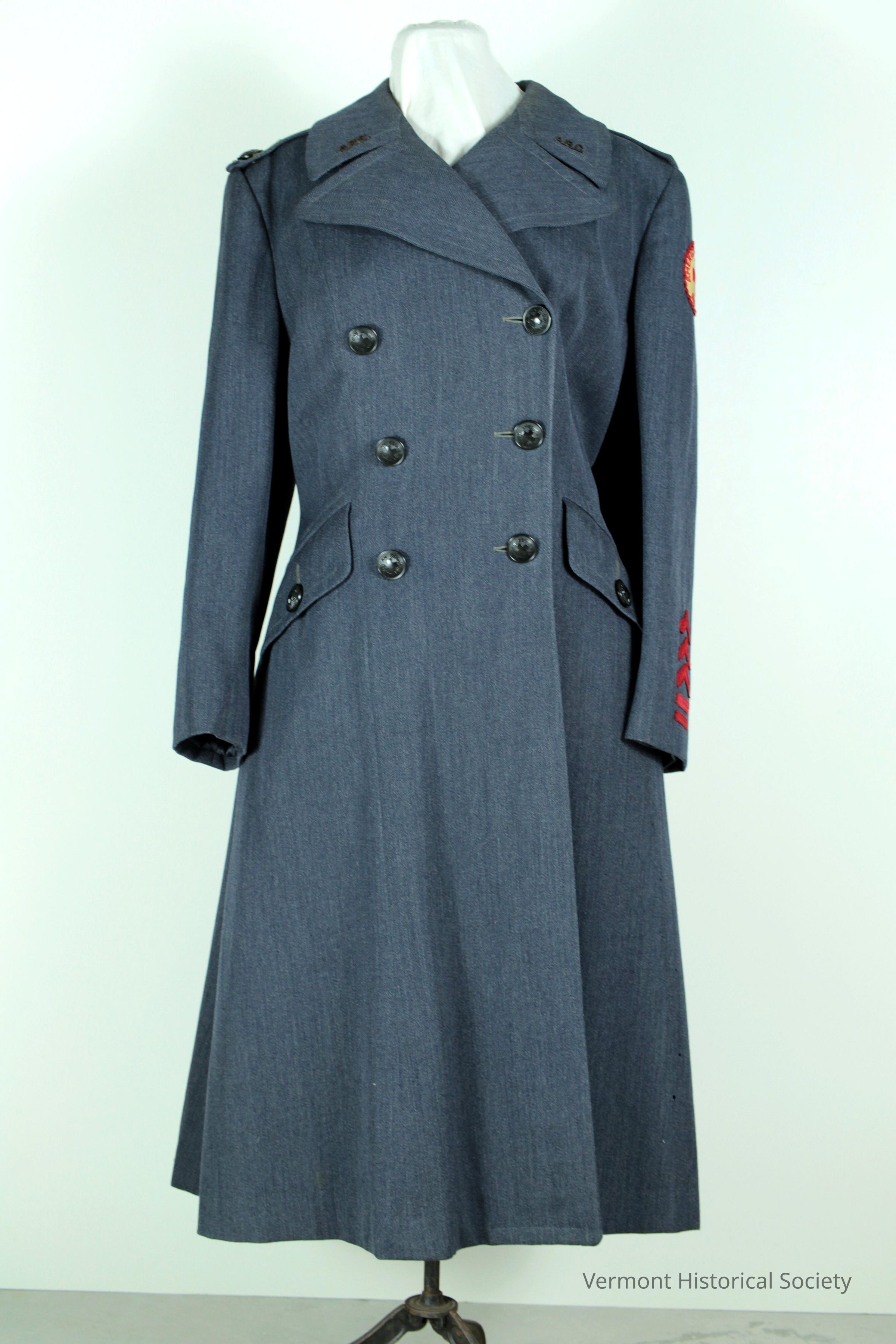 Double-breasted blue wool coat. The full-length coat opens in the center and secures with three buttons (six visible). There are two front pockets that secure with flaps. The lapels are decorated with matching "A.R.C." pins. There are green grosgrain epaulets. The upper right arm has a round white patch with an embroidered red cross in the center and the words, "AMERICAN RED CROSS SERVICE", around the edge. The lower right arm has five embroidered patches: three chevrons and two bars. The coat is lined in blue satin.