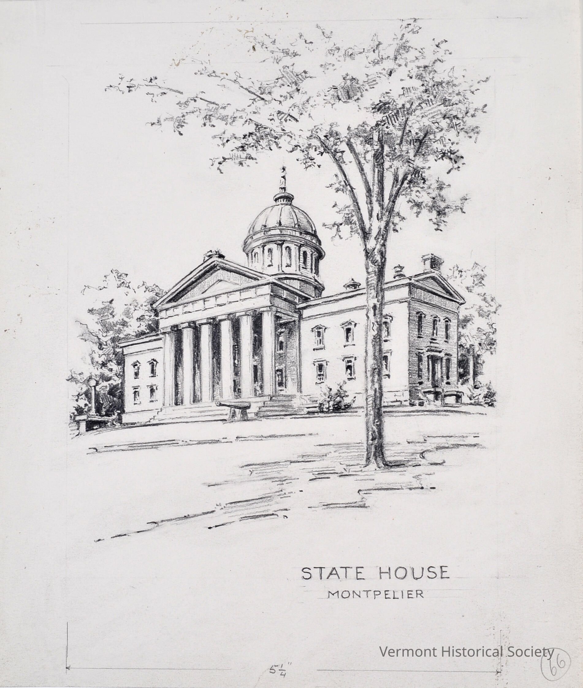 Pencil drawing showing the Vermont State House. The view of oblique from the front right. The building consists of two wings with a central portico and cupola. There is a young tree in the foreground to the right of center. Beneath the tree are the words, "STATE HOUSE / MONTPELIER". The bottom edge of the composition is framed with two horizontal arrows pointing outward, and the number 5-1/4" in the center.Type of Drawing