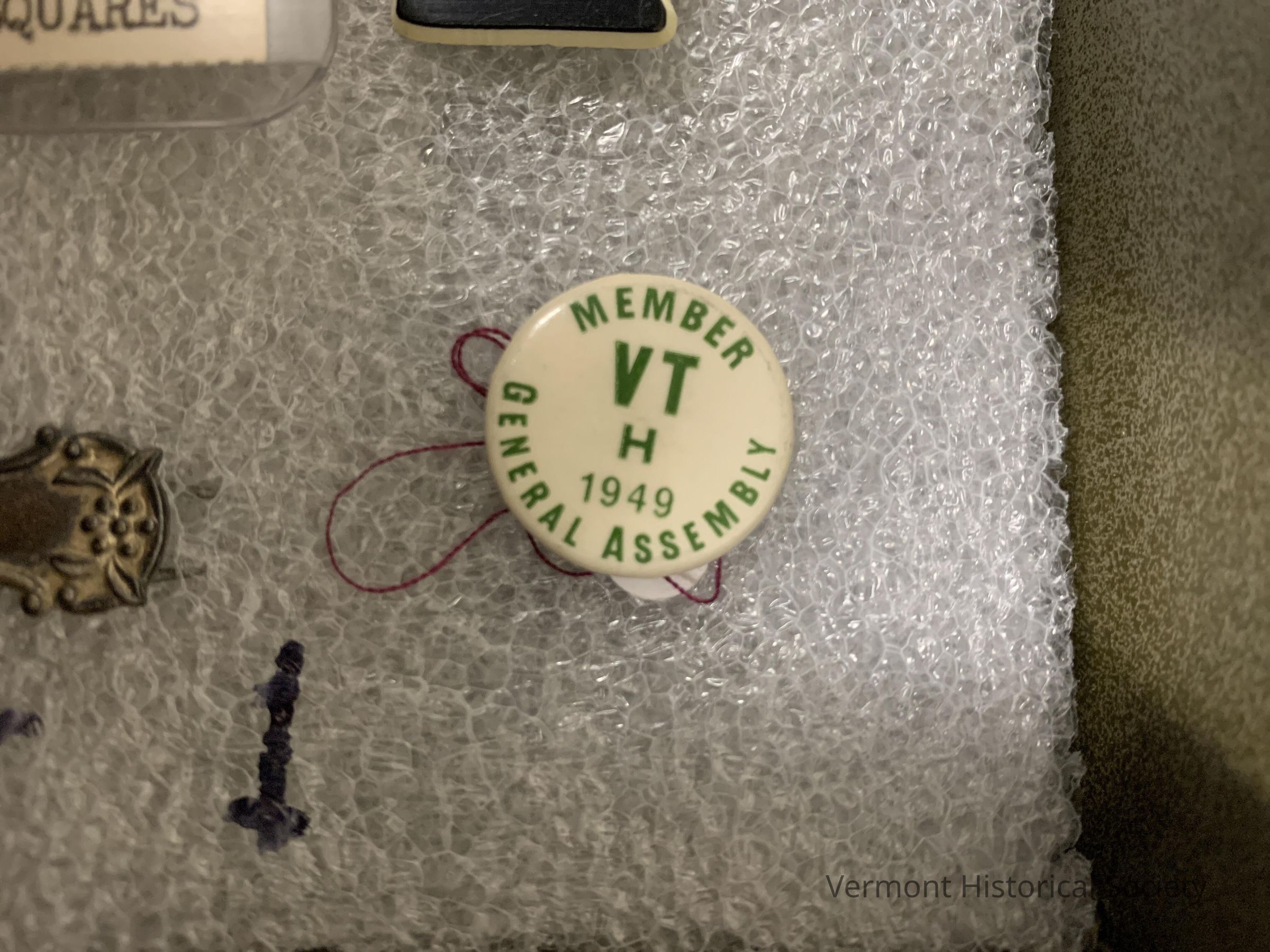 Small white pin with green lettering that says, "Member, General Assembly" around the edge of the pin. in the middle, "VT, H, 1949."Context