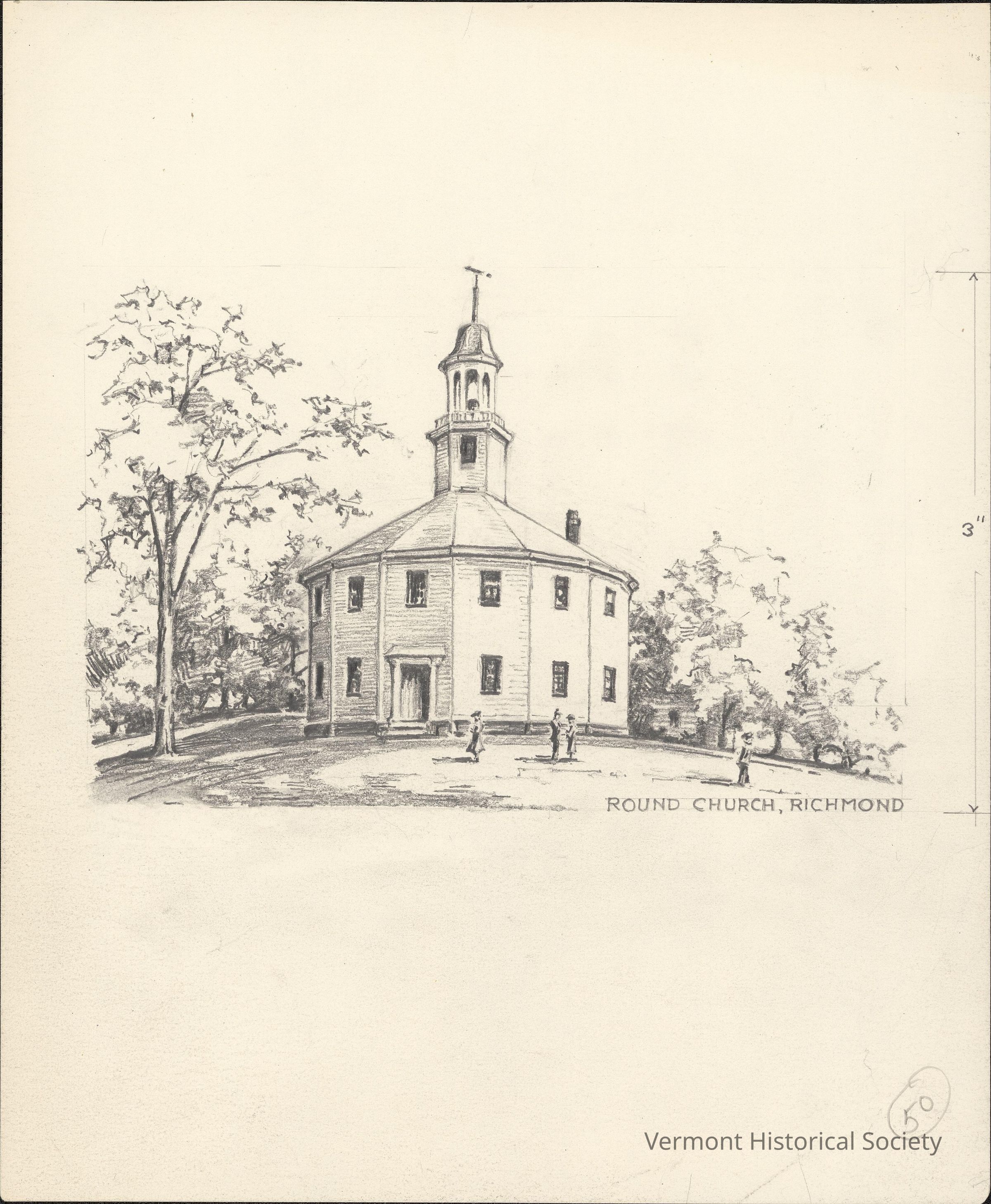 Pencil drawing showing a round building with a central steeple. The building has 6 visible bays. There are 4 people in front of the building. The lower right corner has the label, "ROUND CHURCH, RICHMOND". The right edge of the composition is framed with two vertical arrows pointed away from each other with the number 3 at the center.Type of Drawing