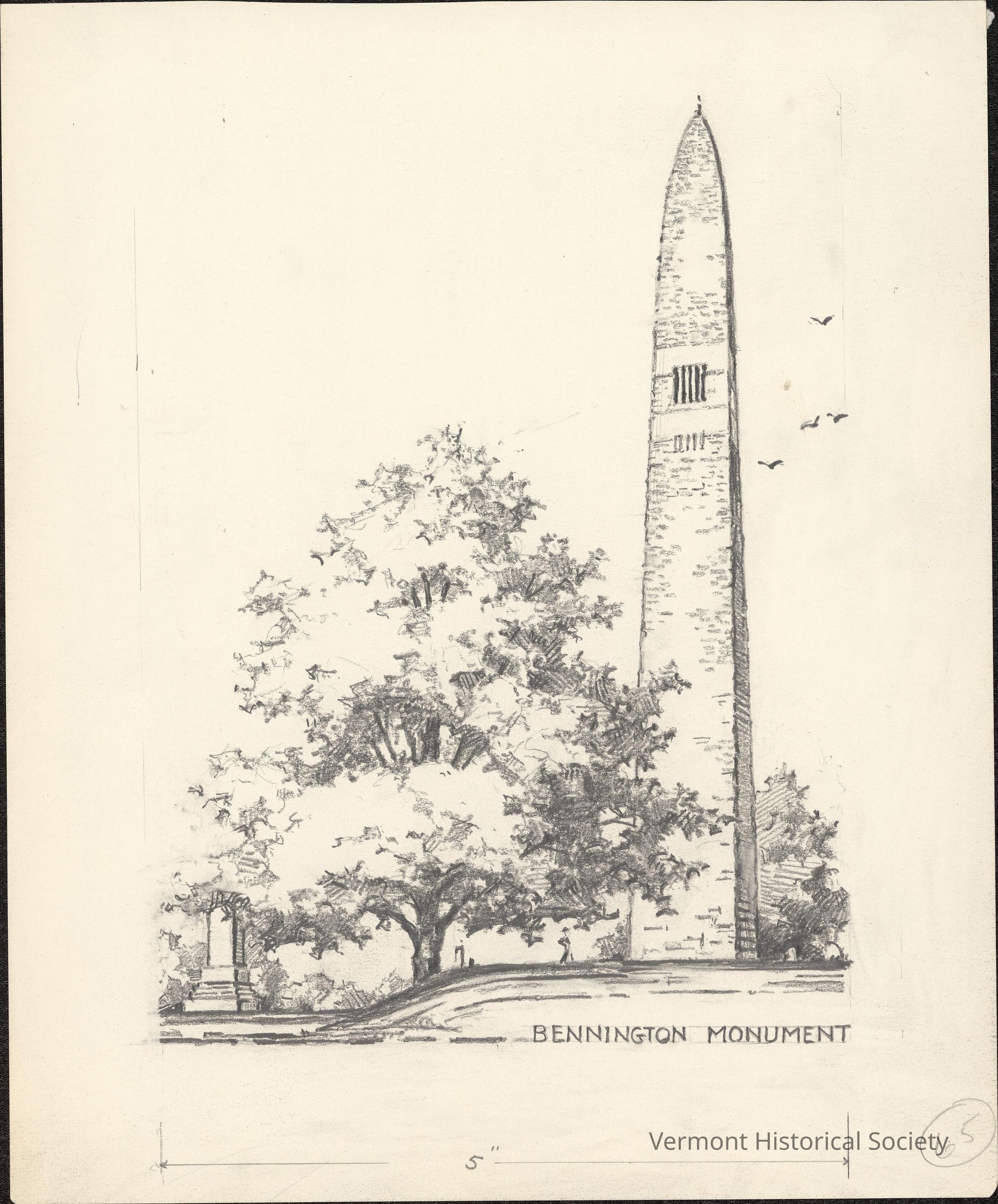 Pencil drawing showing a large obelisk beside a tree. There is a smaller monument to the left of the tree. The bottom right corner is labeled, "BENNINGTON MONUMENT".Artwork Details