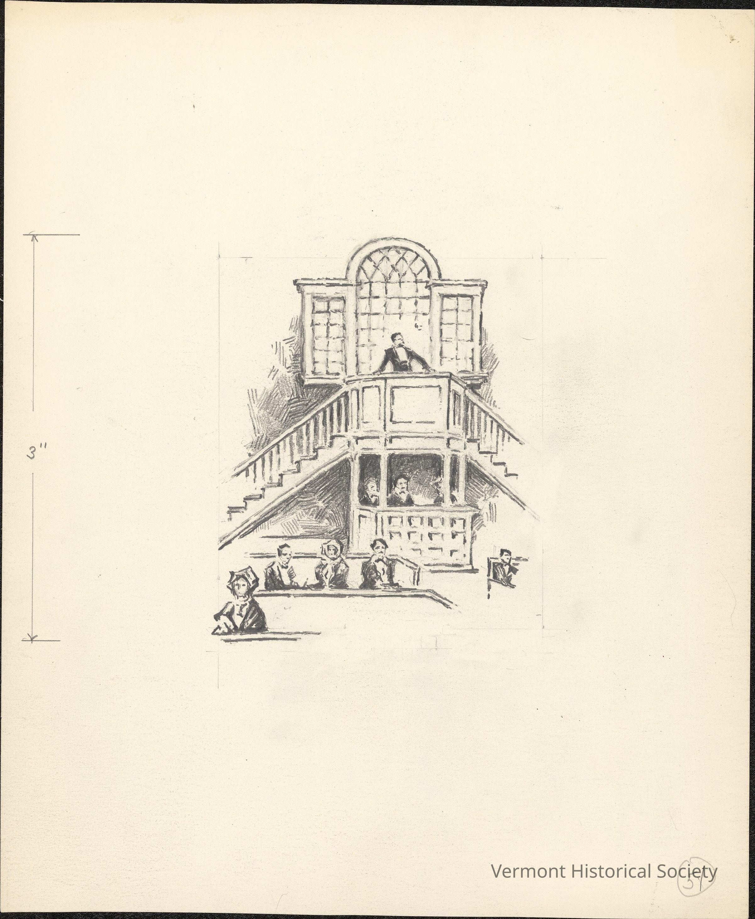 Pencil drawing showing a church interior as seen from the altar. The scene shows three rows of pews that are partially filled with people facing the viewer. At the back is a balcony or pulpit with staircases on both the right and the left. There is a man in a suit standing on the balcony in front of three windows. There are three people sitting in an enclosure beneath the balcony.Acquisition