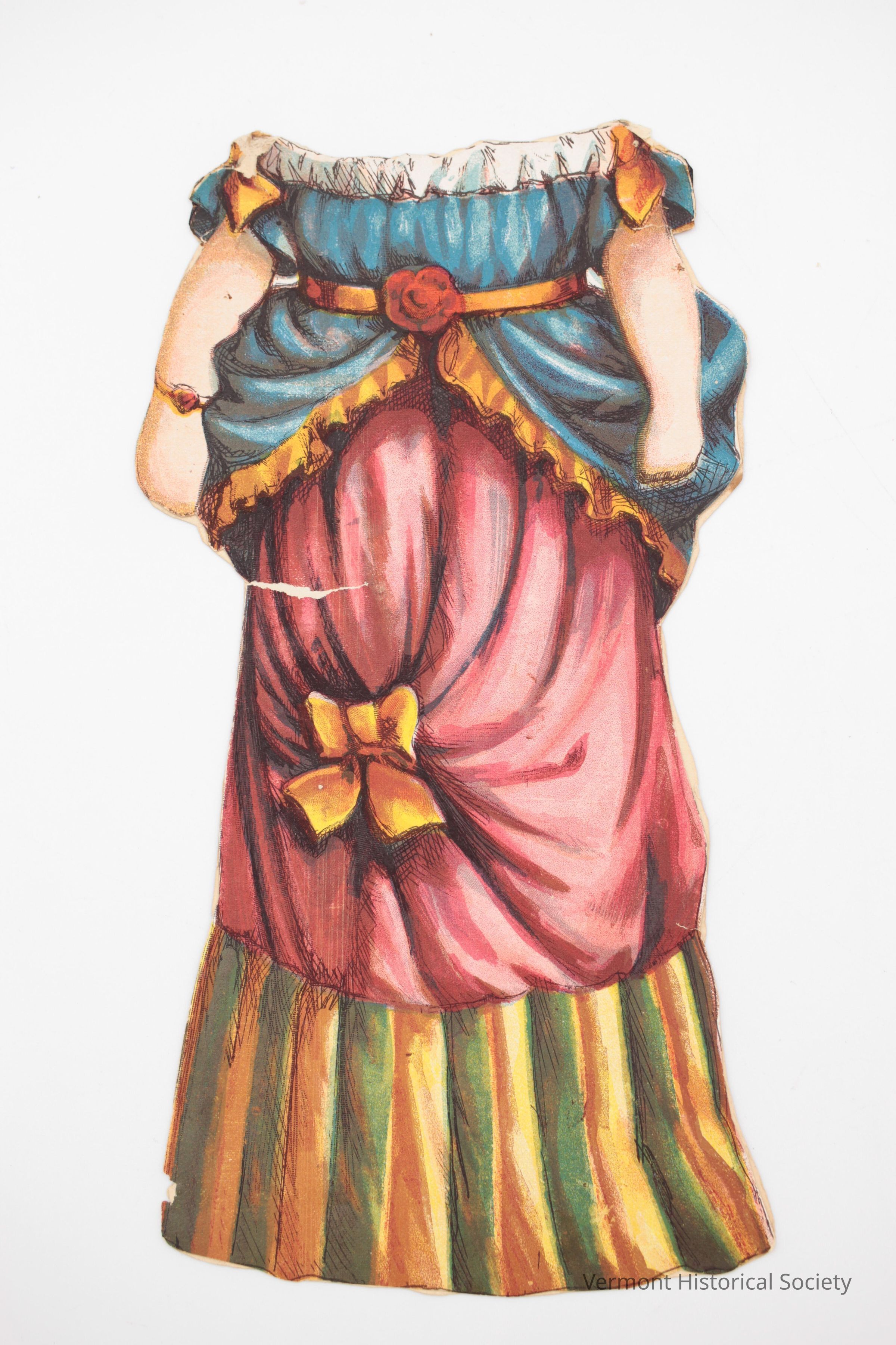 Two-sided paper doll dress. The dress has a blue off the shoulder bodice and bustle trimmed with yellow ruffles, and a pink skirt with a green and yellow hem. The back shows that the bustle is triangular. The two sides are connected at the shoulder to fit over the doll.Acquisition