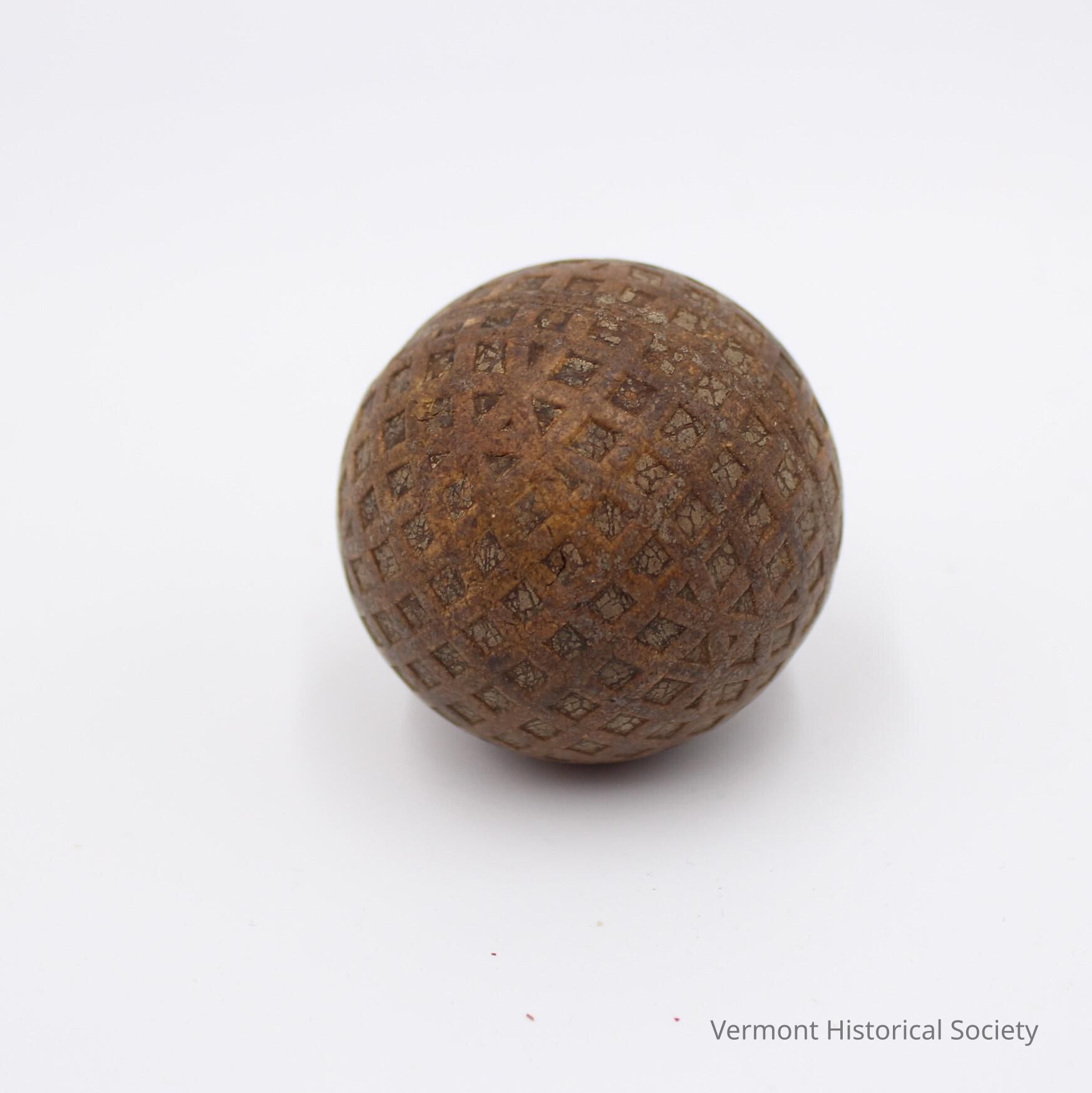 Small wooden golf ball. The ball is molded to have a gridded pattern on the surface.