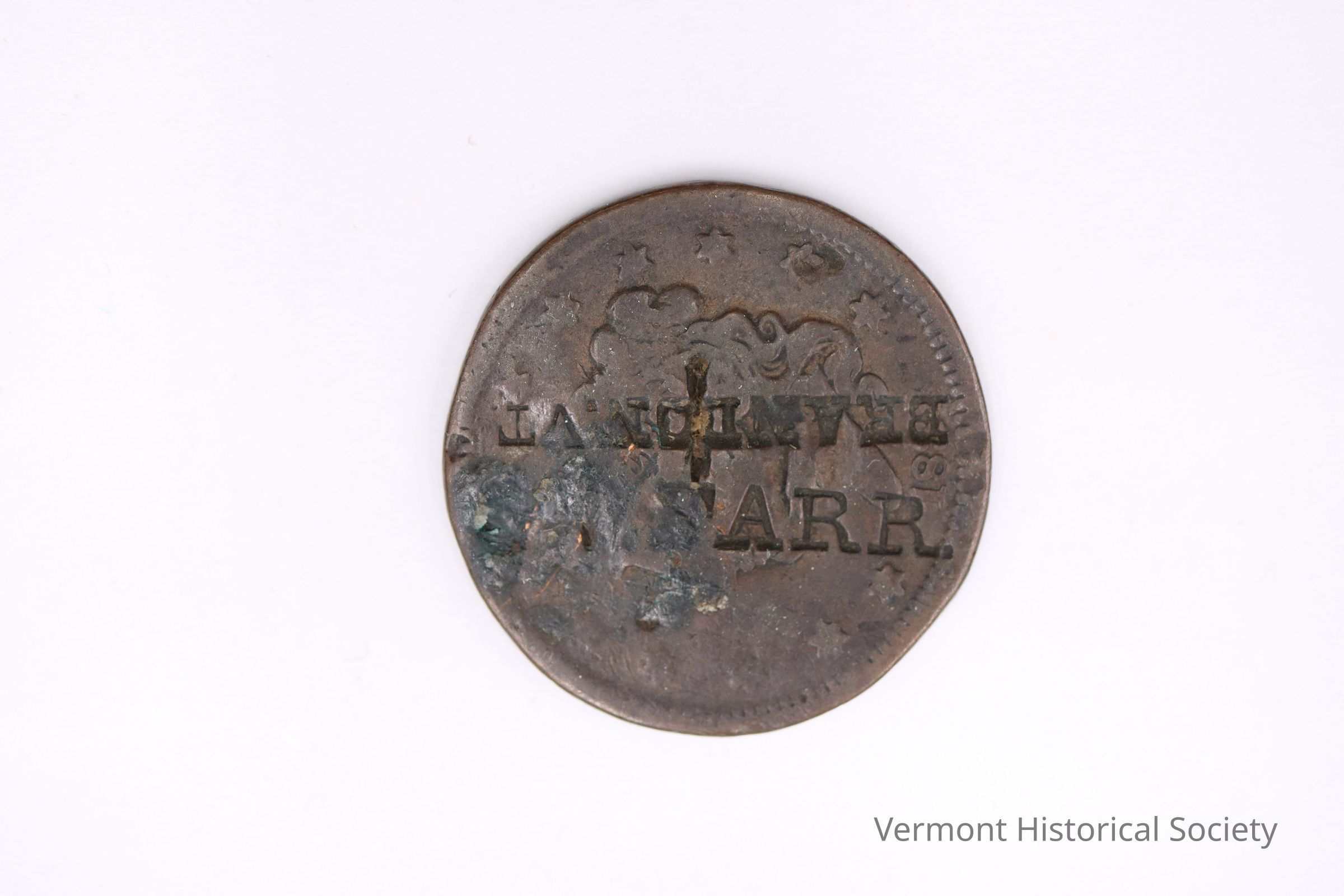Coin (liberty cent) counter-stamped with the name, "G. V. FARR" on both sides, and the label, "BRANDON, VT" on one side.Use