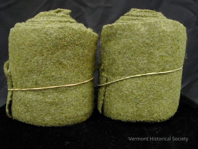 Pair of khaki wool puttees that were worn wrapped around the legs. They consist of long strips of wool with unfinished edges.Context