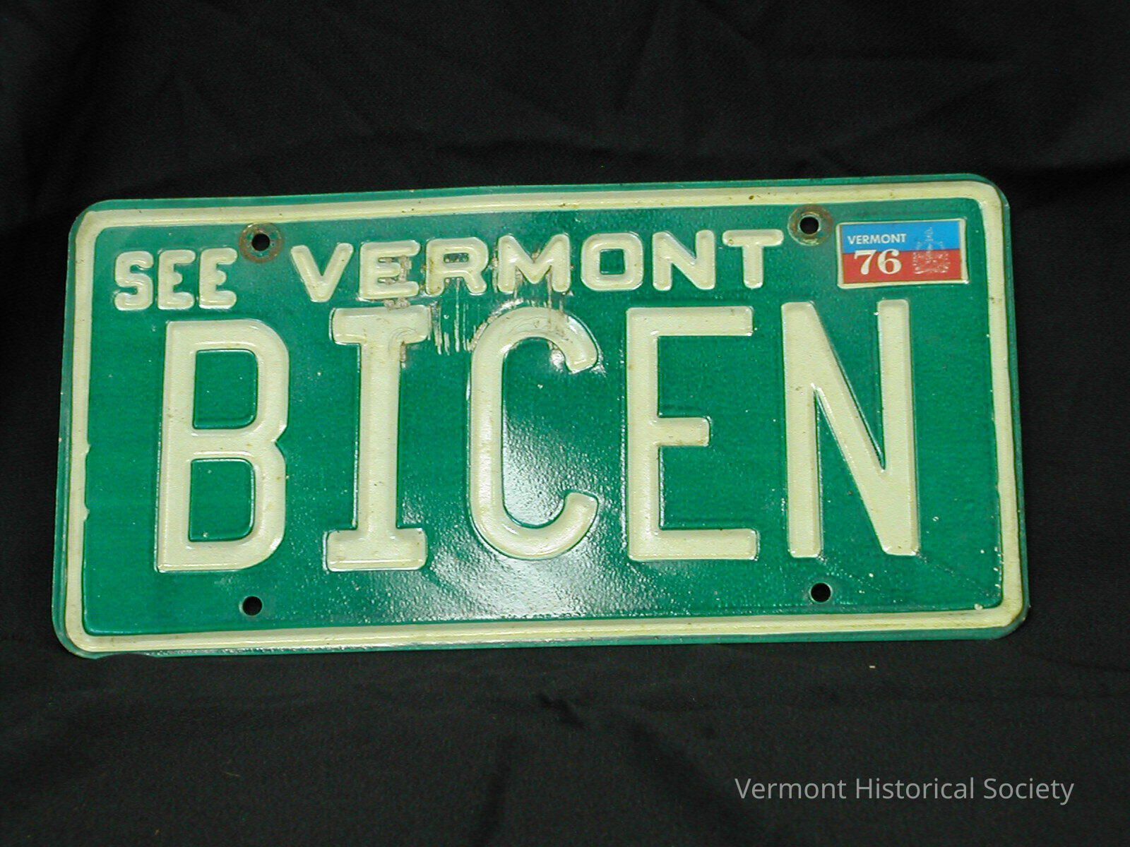 Green rectangular license plate. The top of the plate has the inscription, "SEE VERMONT" and the license number is "BICEN". The upper right corner has a blue-and-red sticker with the Vermont state seal and the inscription, "VERMONT 76".
