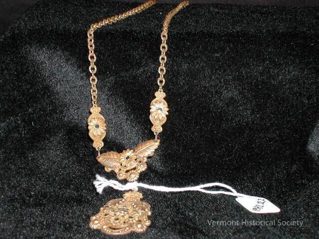 Necklace consisting of a brass chain with stamped brass pendants. Three pendants are attached, forming the bottom of the chain, while a large pendant hangs from the center. Each pendant is tamped into a shape of daisies, and each daisy has a cut glass center.