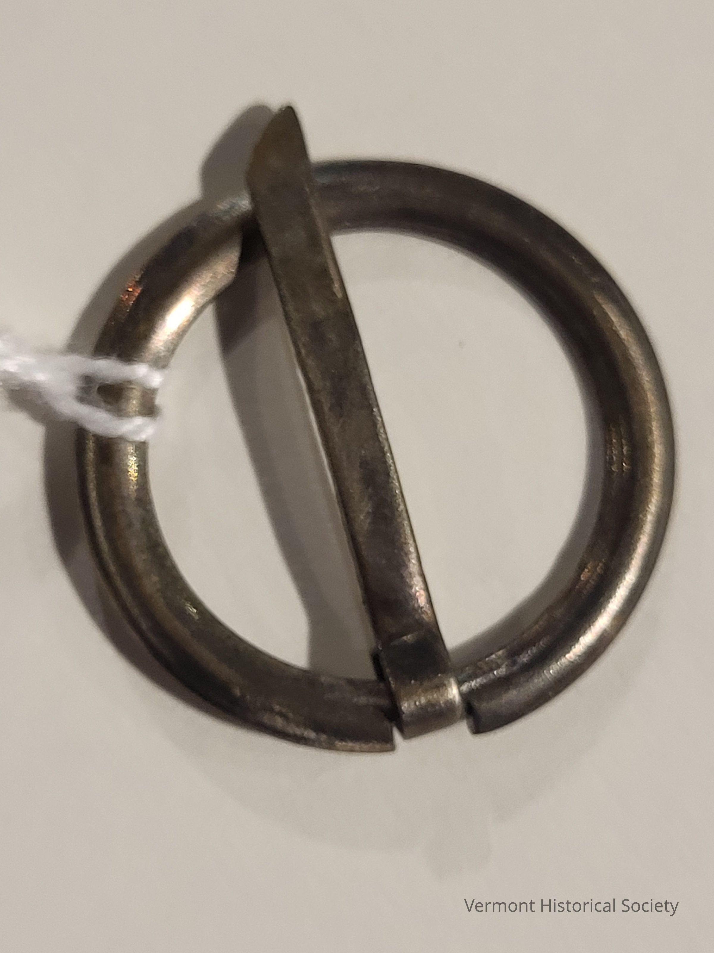 Wiseman states: This brooch, along with L2024.3.4-6 and L2024.3.8, were found in a Riker mount in the group shop, with a Western NH provenance and an assurance that they were solid coin silver and old. They were in almost pristine condition without much if any crinkling of the central prong. I worry that they were good repros, but they are not embossed “India” like many modern reproductions. They were full price, so I bought them for the provenance, but am unsure of their age, since trade silver is not my specialty.Acquisition